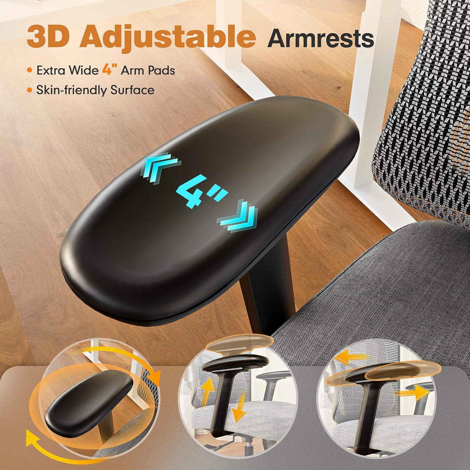 ELABEST Ergonomic Office Chair,Home Desk Chair with Mesh Back,Adjustable Lumbar Support,Built-in Springs Wide Seat,Executive Task Chair with 3-D Big Armrests,Tilt Function,Computer Desk Chair (Grey)