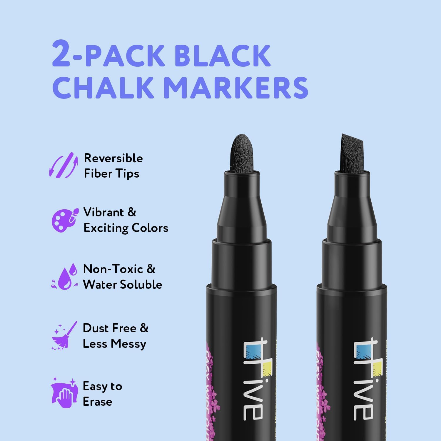 TFIVE Black Liquid Chalk Markers - 2 Pack Bright Colors Erasable Chalk Marker Pens, Reversible Tip, Non-Toxic, for Chalkboards, Signs, Glass, Easy to use Chalk markers TF800