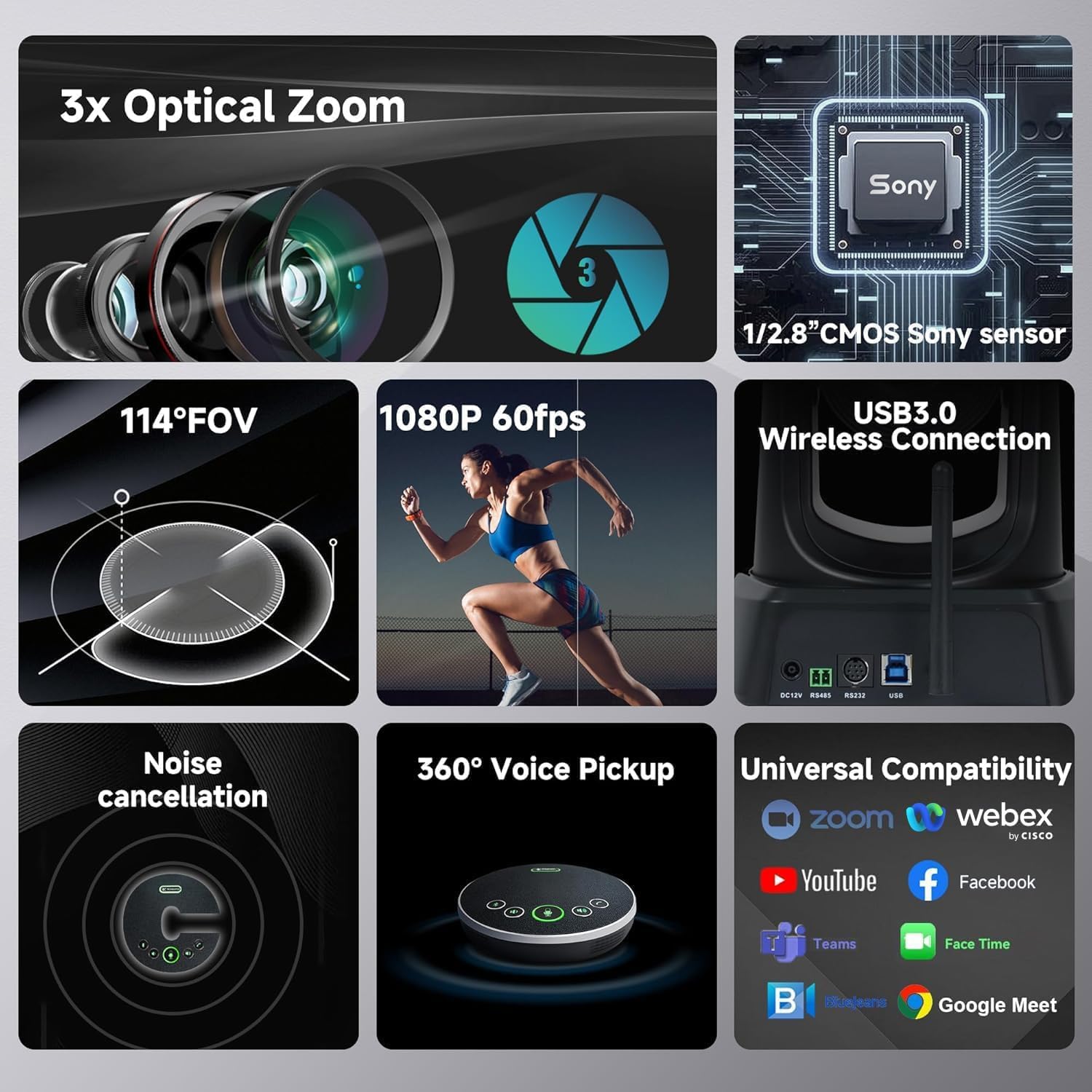 - FULL HD VIDEO CONFERENCING WIRELESS EQUIPMENT SYSTEM. Conduct your Hybrid meetings with the TONGVEO 3X wireless PTZ conference camera system. Pan Tilt Camera with 114° wide field of view with no video distortion.Offers better video and audio solutions. Elevate your collaboration efforts with superior sound and picture quality for enhanced productivity. Launch video and audio meetings easily at video calls, video conferences, online courses, Telemedicine, remote training, remote interviews, etc.