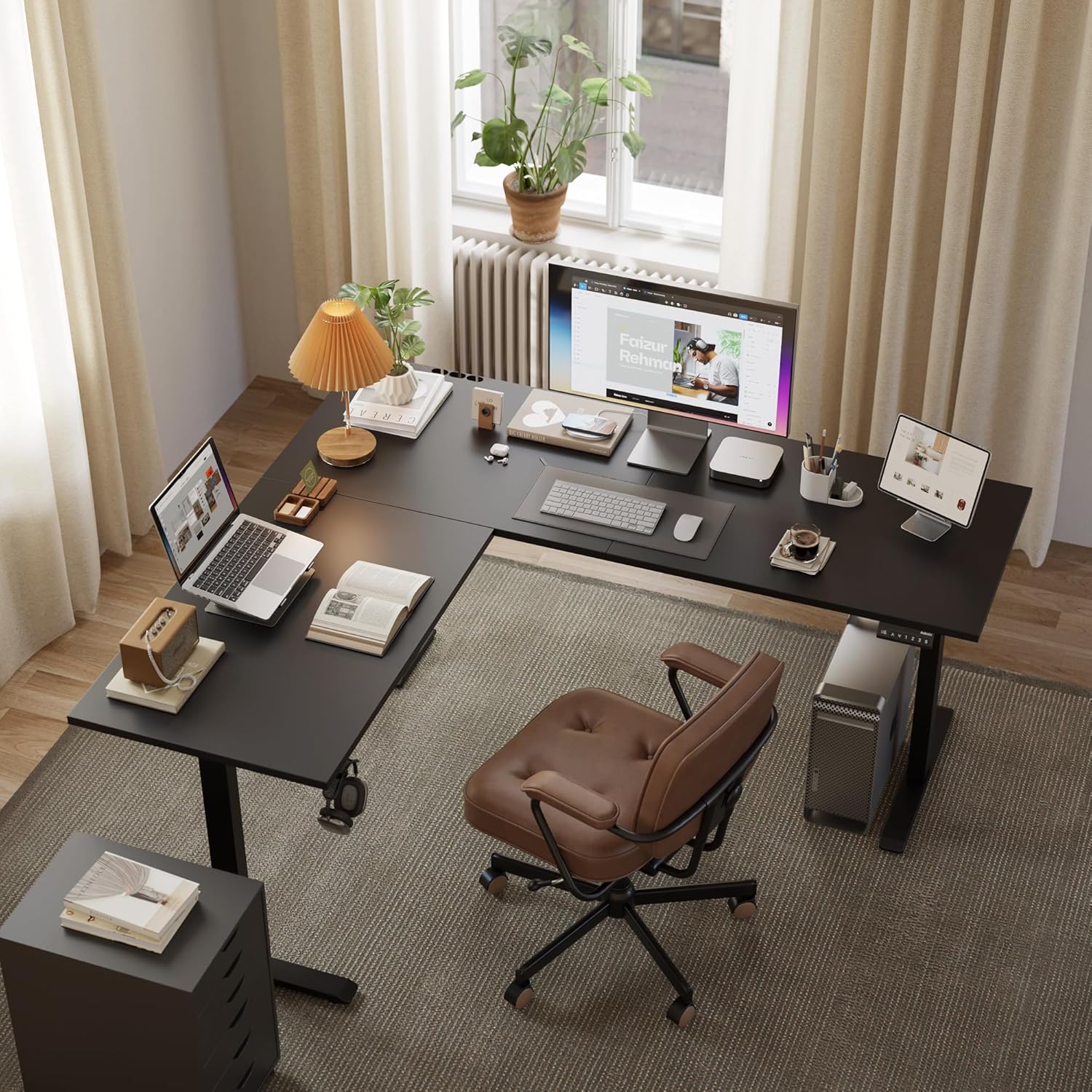 - 「63" Ample Workspace」63*55" L-shaped adjustable height desk is perfect for home office and gaming by providing large space. Extra-large space easily holds 3 desktop PCs, 1 laptop, and other office accessories.
