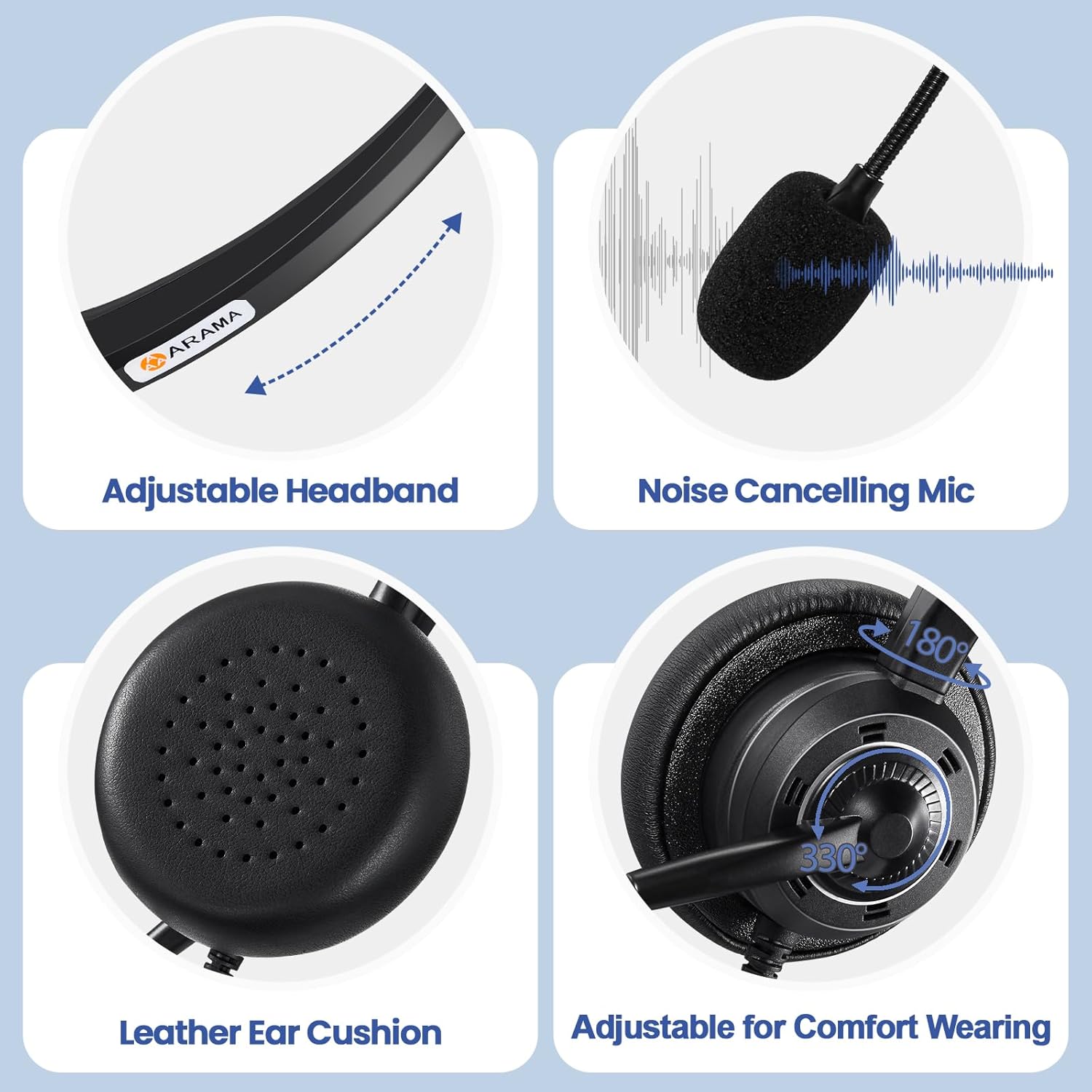 - ✅【Comfortable to Wear】Arama headset has a lightweight design and the microphone can be rotated 330°. The headband is adjusted according to different head shapes. The ear pads use protein material leather cases, which are excellent breathability, so you will not feel sultry or uncomfortable. For those who need to call a long time, this usb computer headset with a microphone will not cause too much pressure on your ears and heads, which is a good choice.