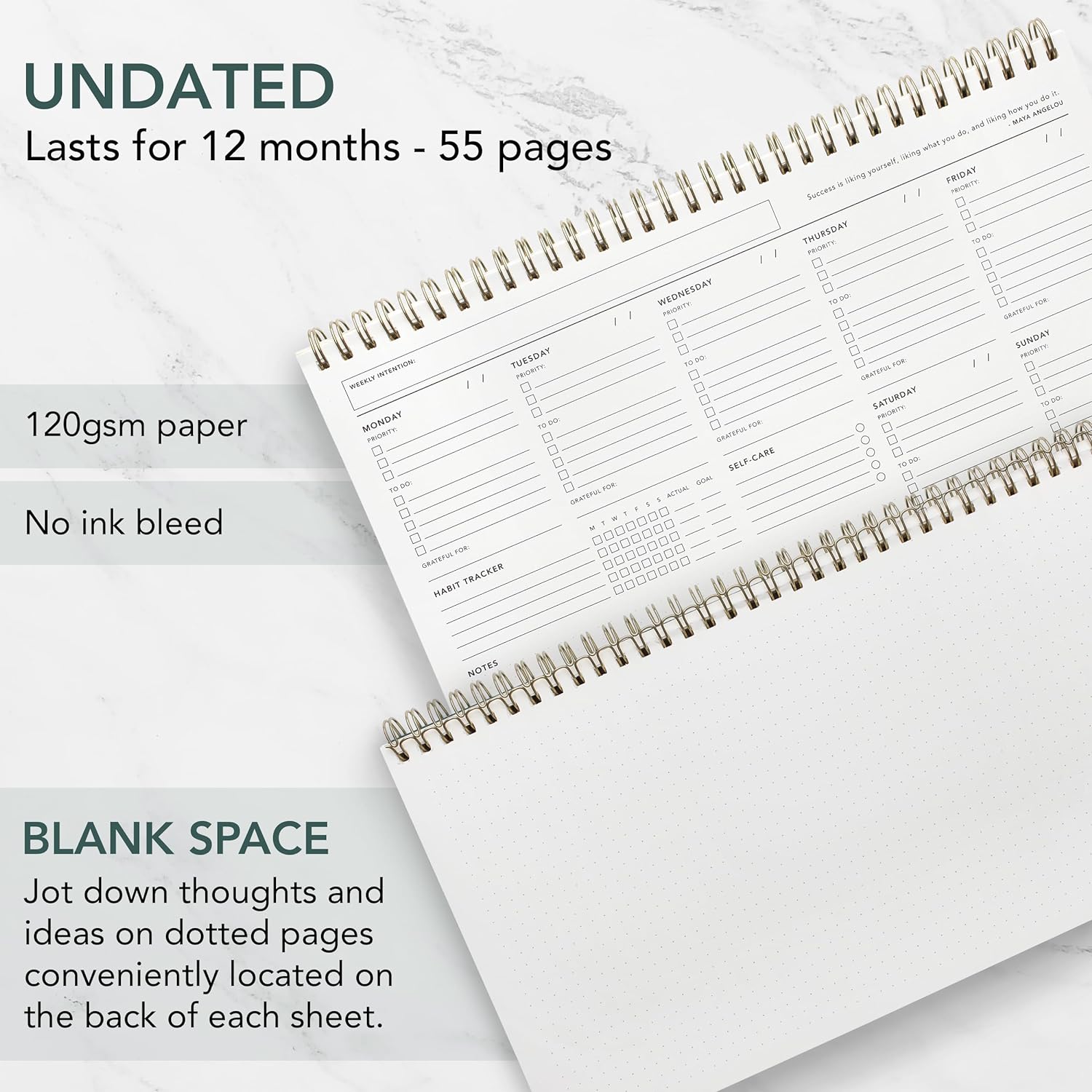 - ✍️ PREMIUM QUALITY PAPER : Made from120gsm paper, this weekly daily planner offers the perfect balance - not so thin that your ink bleeds, and not so thick that it's bulky.