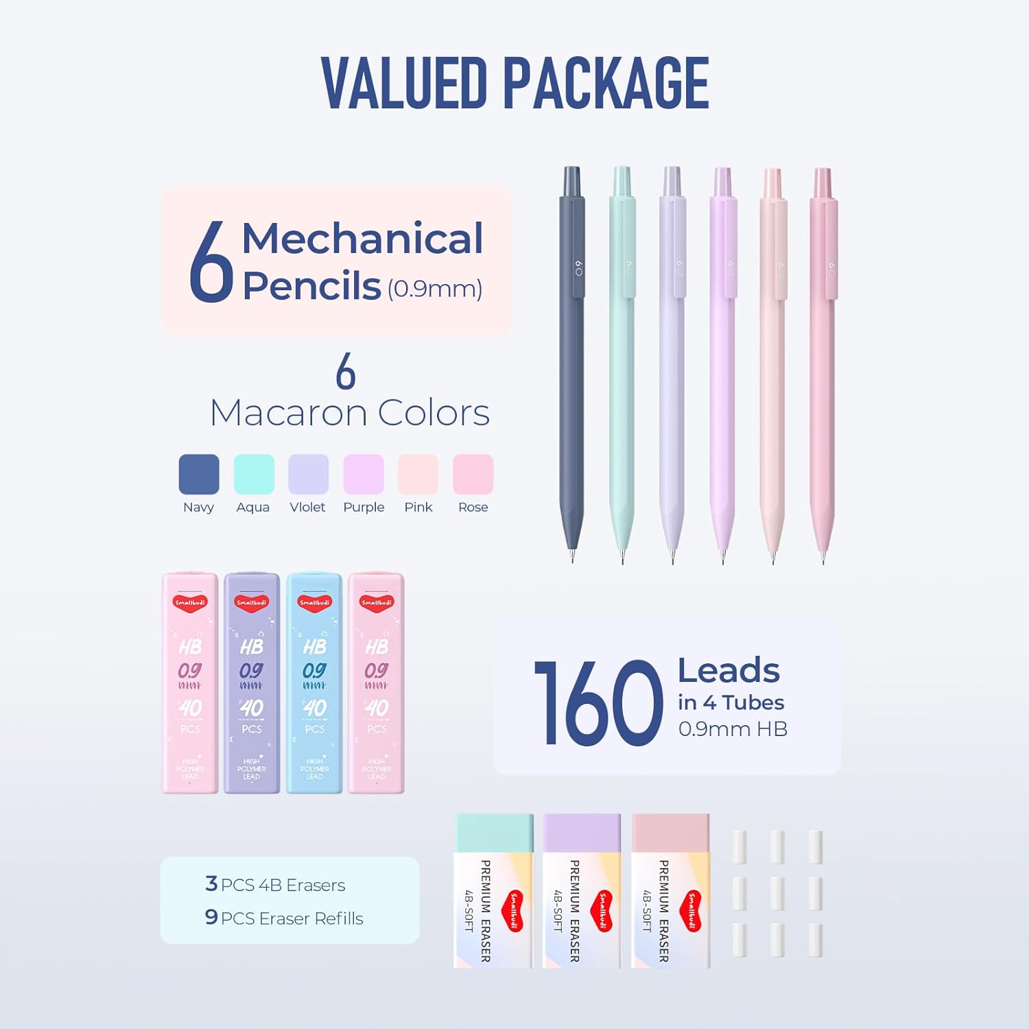 6PCS 0.9mm Mechanical Pencils Set with Case, Cute Pastel Mechanical Pencil with 160PCS HB Lead Refills, 3 Erasers, Aesthetic Back to School Supplies for Student Writing Drawing Sketching