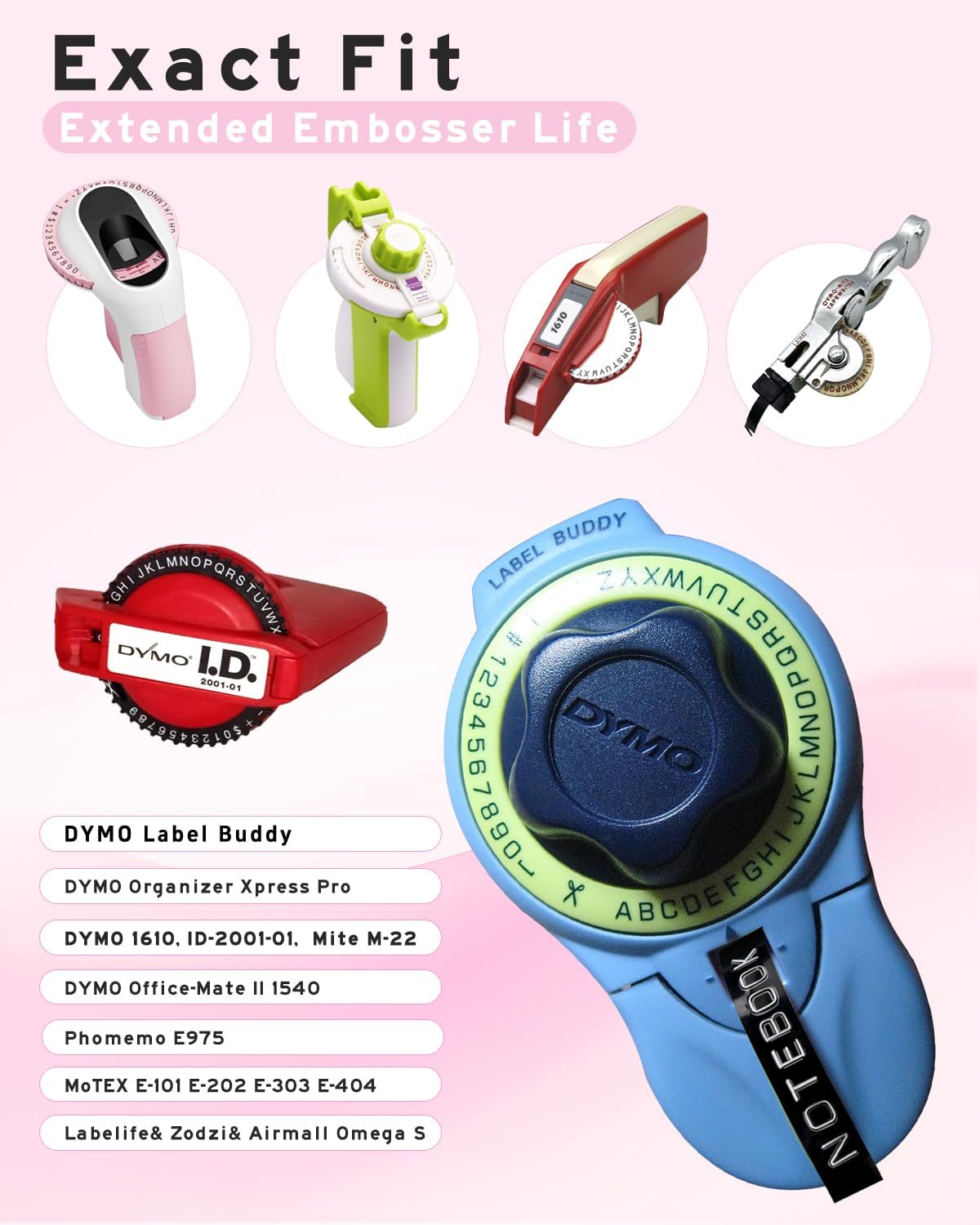 - Compatibility: Work for Dymo embossing label maker Organizer Xpress, Pro 12966, 12965, 1610, 1550 1595 1570, Office Mate II 1540 154000, i.d. 2001-01, Mite, Junior, Label Buddy, Older School, Phomemo E975, MoTEX E-101 E-202 E-303 E-404 E-505 and Labelife Zodzi Airmall Omega S Vintage Embosser