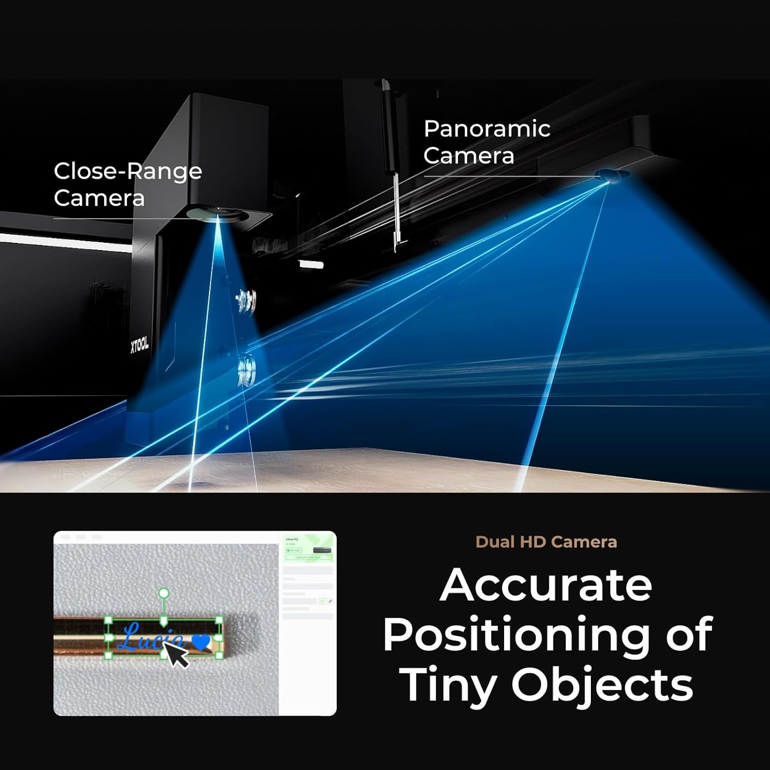 - Intelligent Desktop Laser Cutter & Engraver: Thanks to the dual 16MP smart cameras, xTool P2 CO2 laser engraver can automatically construct 3D models of curved objects to make curved surface engraving as perfect as flat, can intelligently recognize shapes to fill pattern on multiple objects and engrave them in one batch. If assembled with the Automatic Conveyor Feeder, xTool P2 also provides the automatic passthrough for precision and convenience when engraving and cutting extra-large materials.