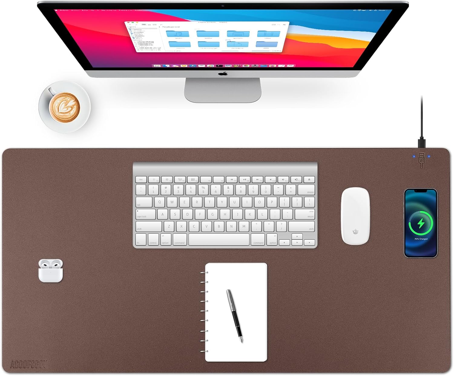 Wireless Charging Desk Mat with Desk Pad for Desktop Charging Large Mouse Pad Waterproof Leather Computer Mat Mouse Pad Non-Slip Protector on Top of Desks for Keyboard and Mouse (brown-r, 36*17inch)