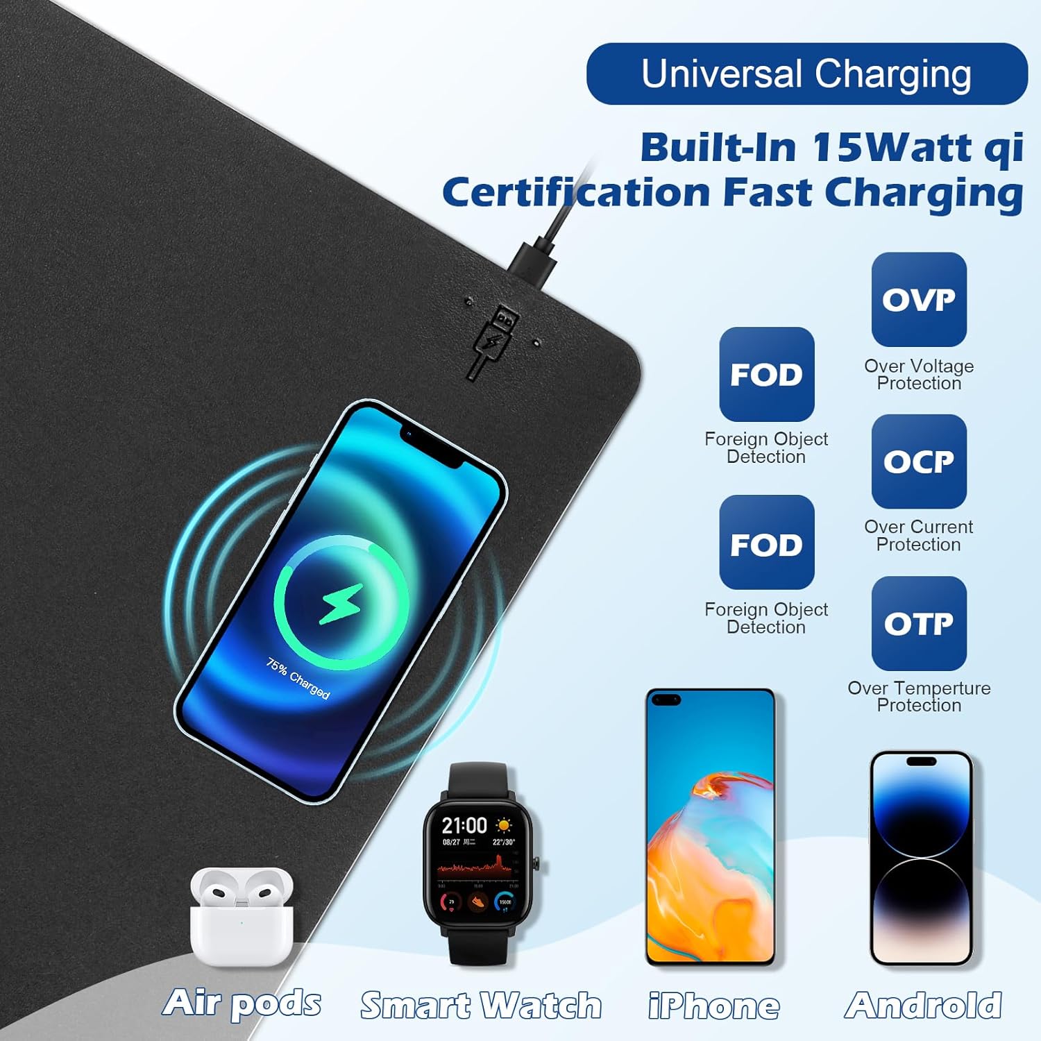 Wireless Charging Desk Mat with Desk Pad for Desktop Charging Large Mouse Pad Waterproof Leather Computer Mat Mouse Pad Non-Slip Protector on Top of Desks for Keyboard and Mouse (black-r, 32*16inch)