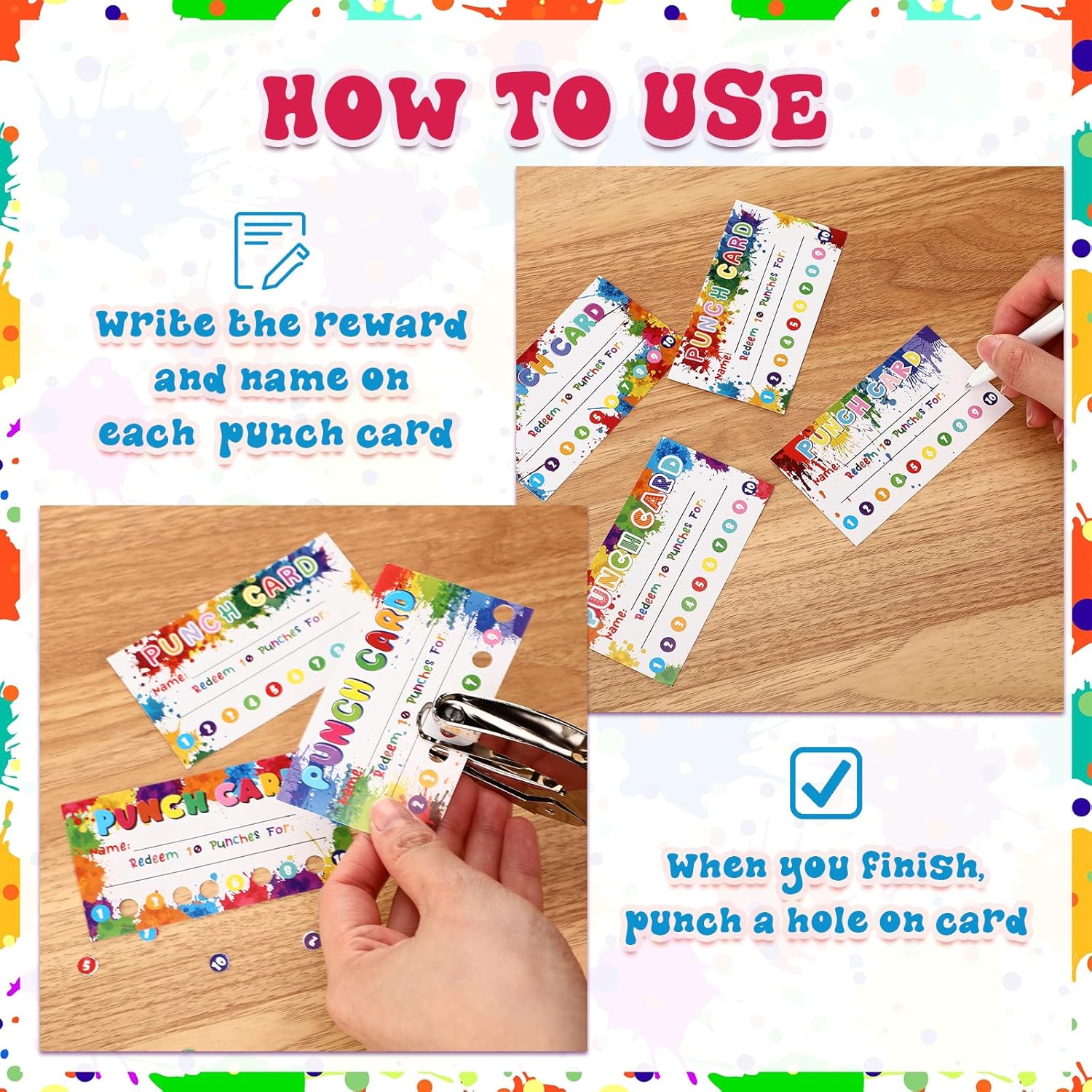 - Fun to Use: you can punch one hole on the reward chart for kids every time they accomplish a goal or task, when all the 10 punches finished, celebrate accomplishments with them and give them the rewards