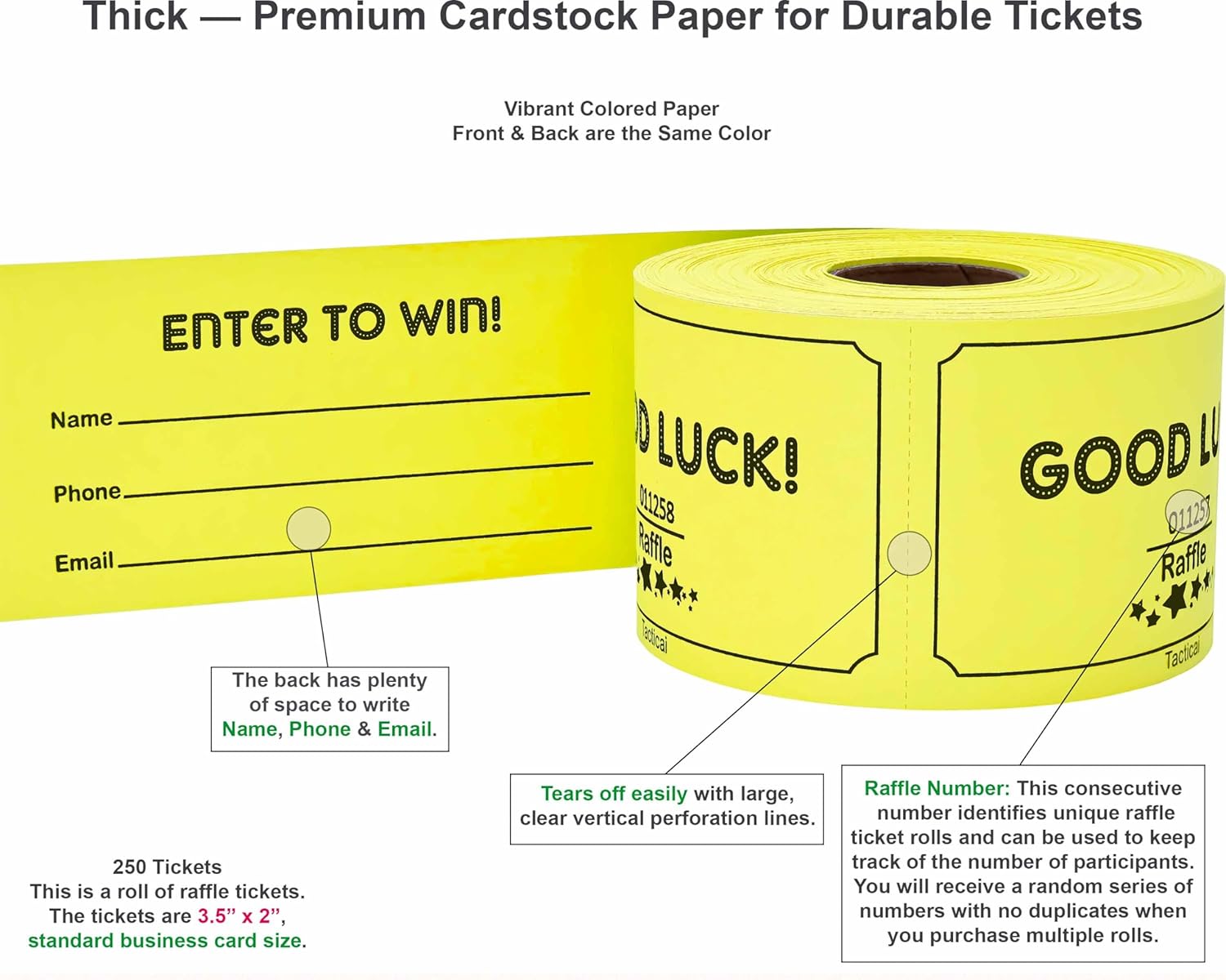 - RAFFLE OPTIONS – Each pack contains 250 raffle cards that can support small, medium, and large events. Easy to write for collection of name, phone number and email address. Each ticket is 3.5” x 2”.