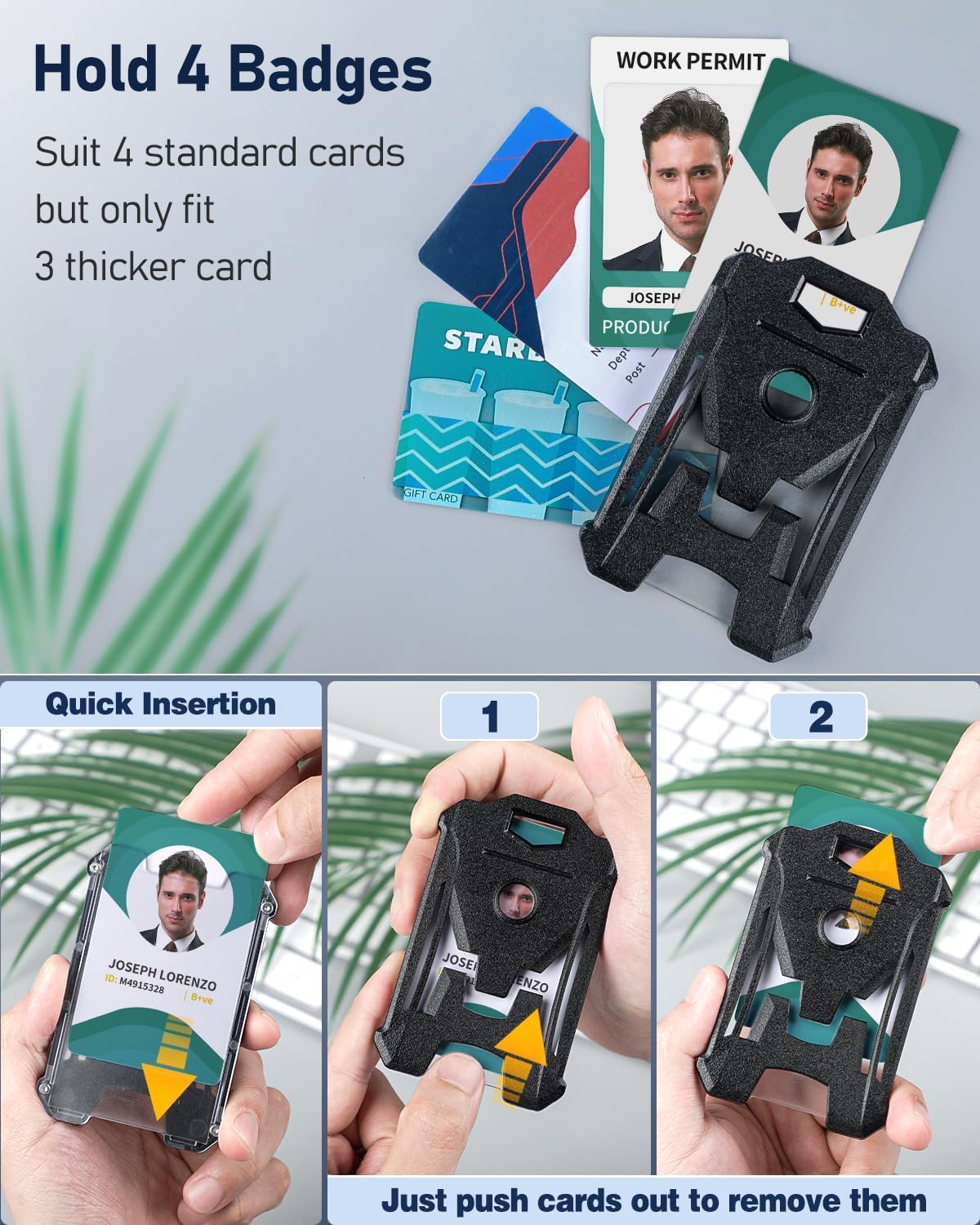 - Hold 4 Badges: Inner size: 3.3" L x 2.2" W. Large capacity for up to 4 standard-sized cards like credit cards, ID cards, access cards, driver’s licenses, etc. BUT ONLY FIT FOR 3 thicker cards like proximity cards or RFID badges!