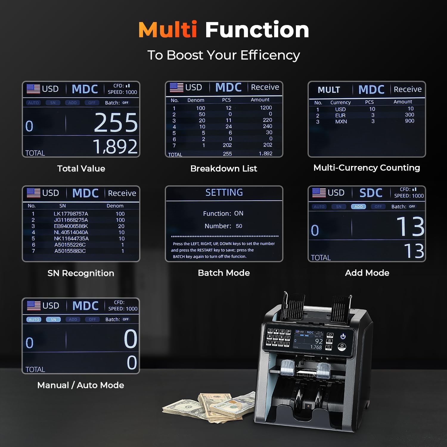 - ✅[12 Counterfeit Detection Methods] Mixed denomination money counter machine ensures your bills’ authenticity(effective against Superdollar) with 2CIS, UV, IR, MT, MG, Dimensional and Thickness, Security Line Variable ink, Spectrum, Fluorescence, Serial Number Recognition Detection. You'll no longer have to worry about receiving counterfeit bills, as your detection is even more accurate than that of the banks