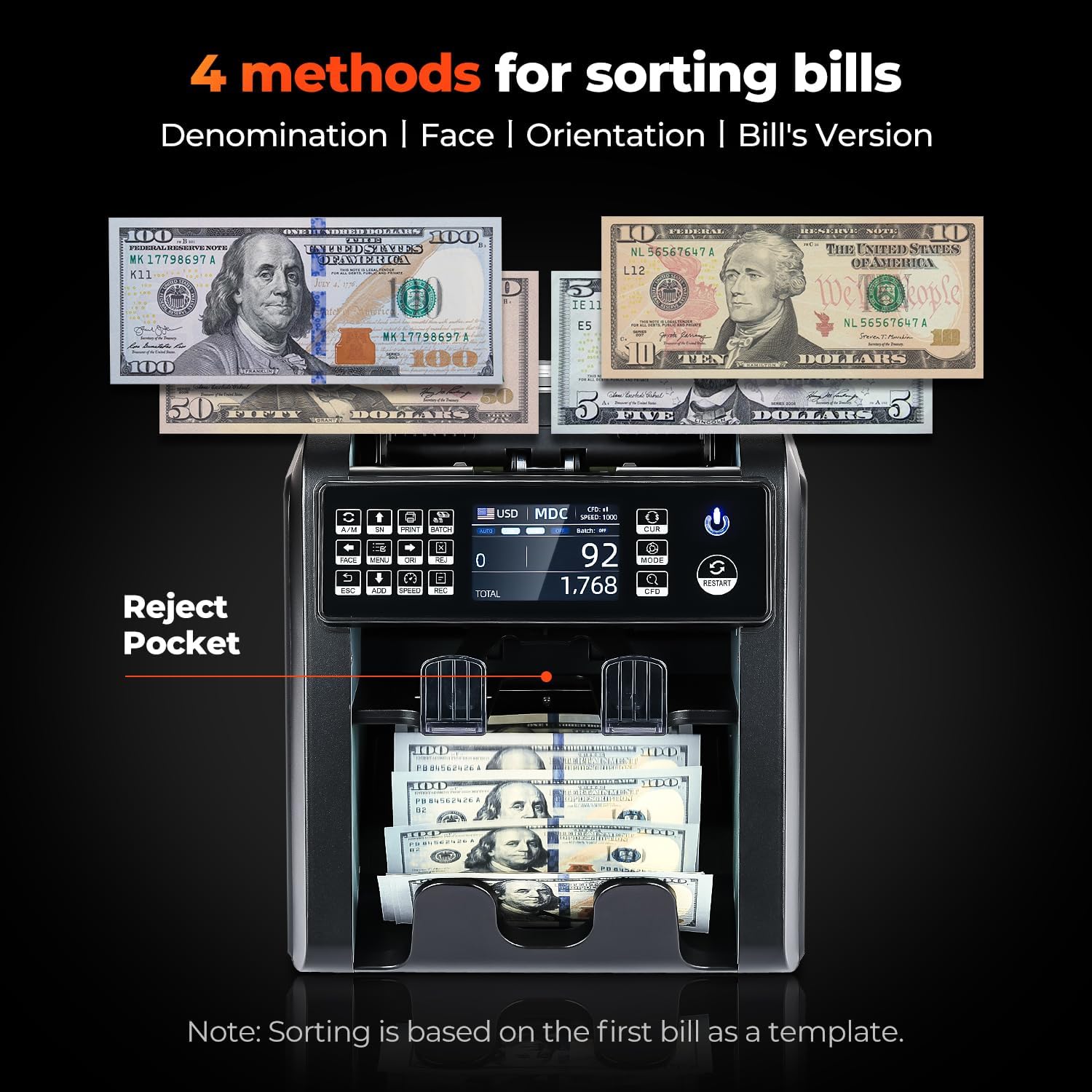 - ✅[Not Just Count, also Sort] MUNBYN IMC08 Money counter machine counts mixed denomination bills and reports the total value and breakdown. With a 2-pocket design, it can also sort the bills by Denomination/Face/Orientation/Currency/Version. Greatly improves your efficiency in handling cash