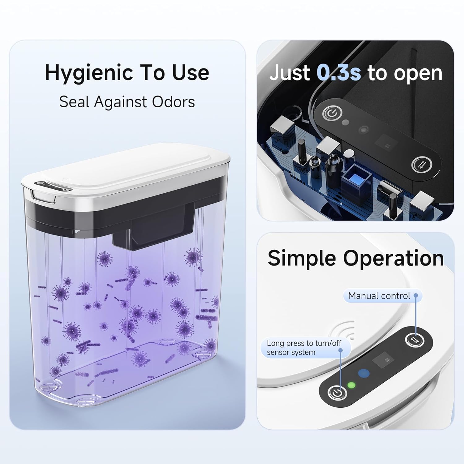 - Special Feature : Motion Sensor, Odor Seal, Removable Lid