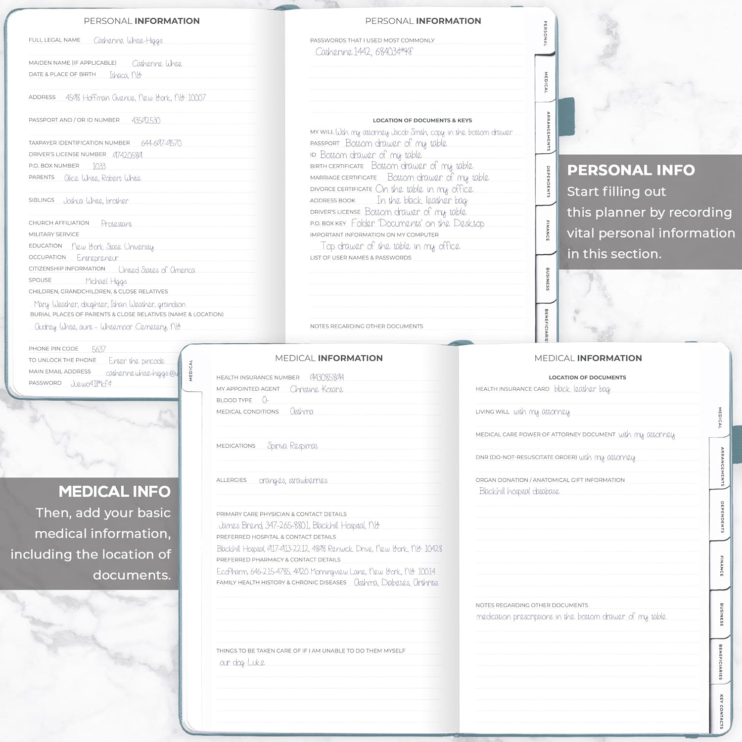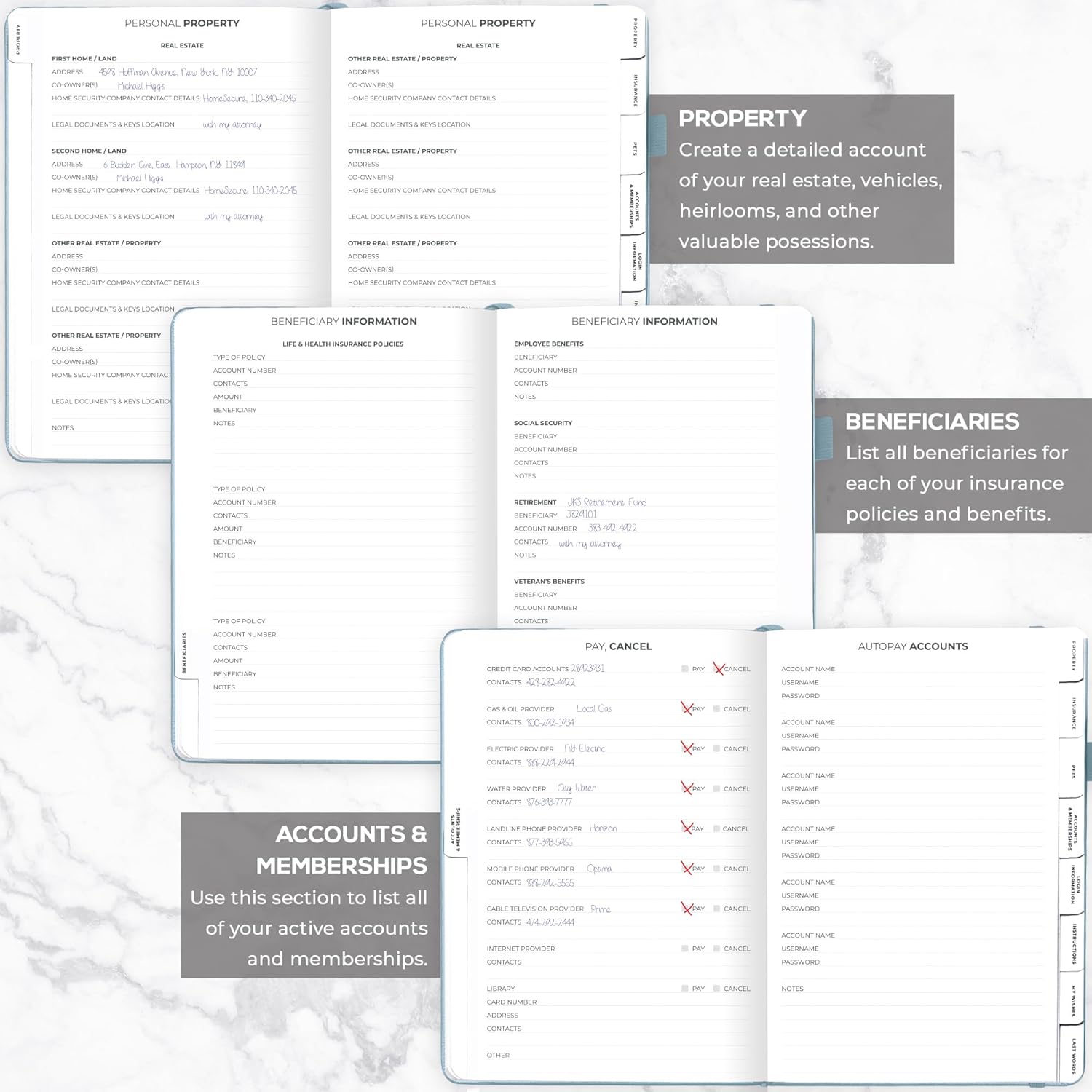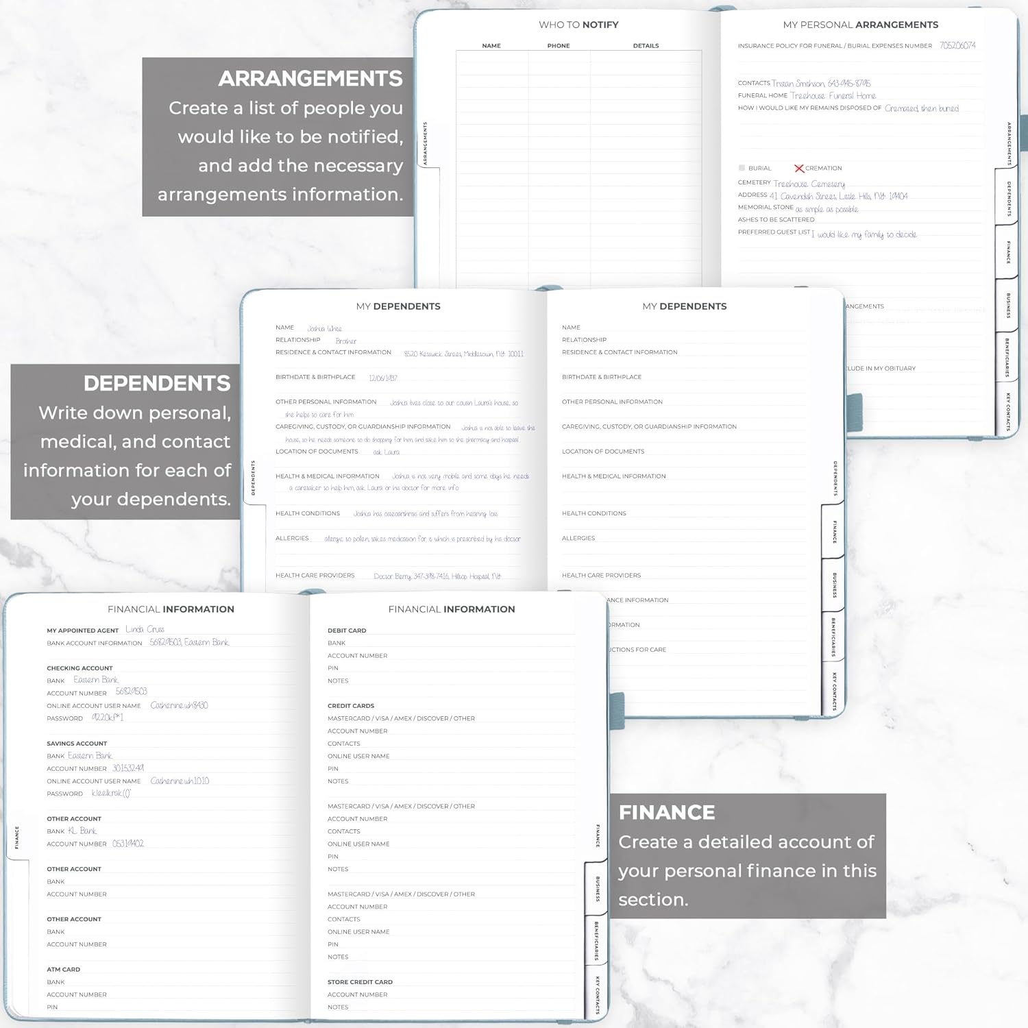 - MEDICAL & FINANCIAL INFO, INSURANCE POLICIES, ACTIVE MEMBERSHIPS & MORE: Inside this funeral planning workbook, you can add care instructions for dependents and pets, personal property, finance & business info, insurance policies, beneficiaries, and more.
