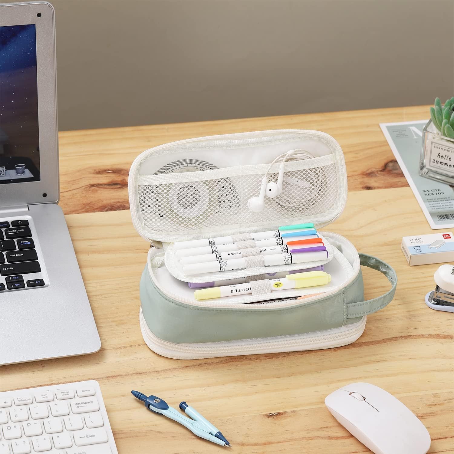 - Product Features: This pencil case has 2 mesh pockets, 2 pencil slot panels, a large storage layer, 2 velcro pockets, and a big pocket inside. the bigger clapboard is removable.