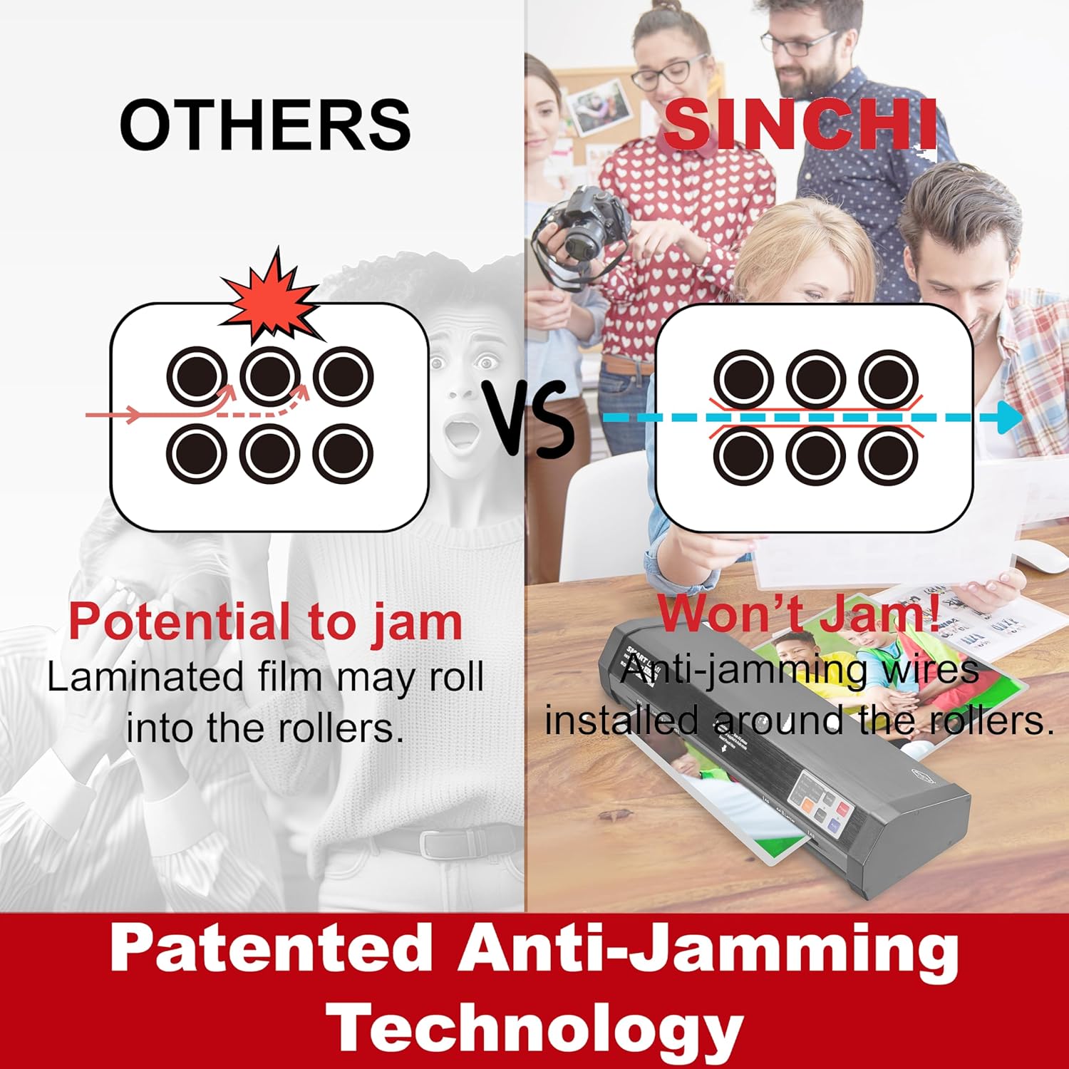 - 【Patented Anti-Jamming technology】The jam-free structure of the rollers makes a jam nearly impossible, most misfed pouches will go through and complete the lamination at acceptable quality.