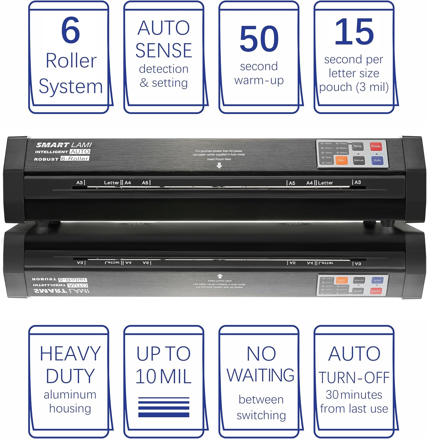 - 【Robust 6-Roller System】The six-roller system, four hot and two cold, contribute to obtain professional lamination output.