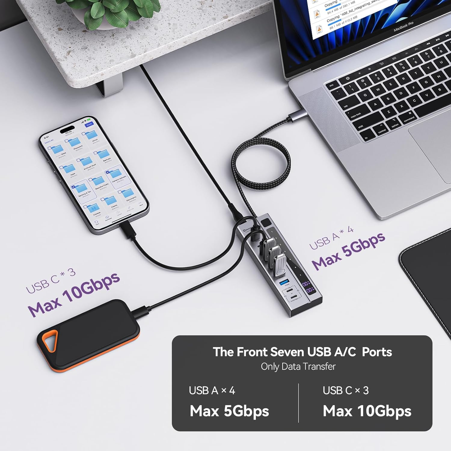 - 【10Gbps/5Gbps Speed Data Transfer】: The usb-c to usb-c hub supports data transfer up to 10Gbps, which is 20 times faster than a USB 2.0 port, it can transfer files, audio, and video efficiently in seconds to external devices. ★Note: The three USBC 3.2 at the top of the USB c ports hub and the four USBA 3.0 at the middle fo the hub ONLY support data transfer.
