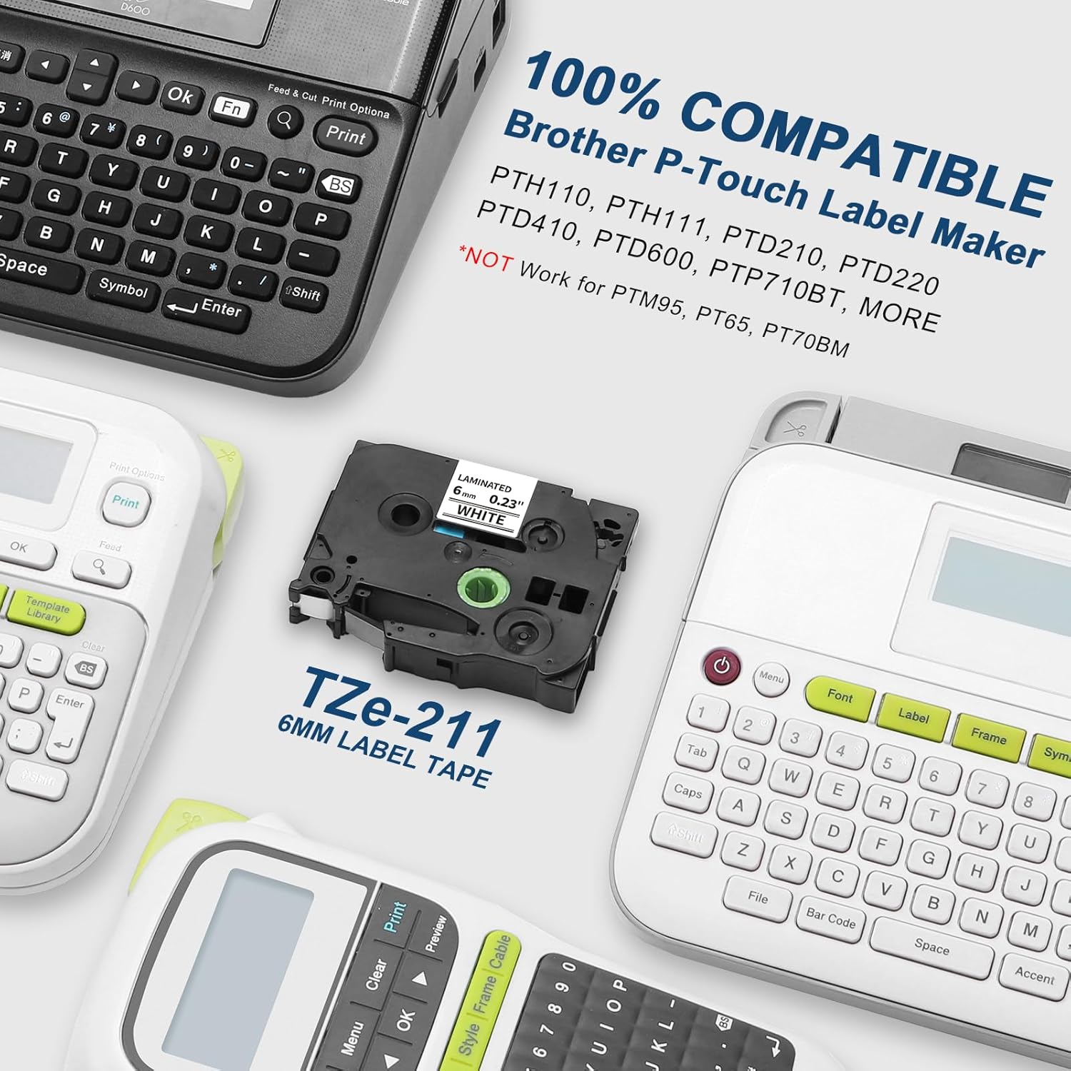 - Compatible with Brother p-touch label maker that using 6mm 0.23 white tze tape, such as PT-H110, PT-D210, PT-D220, PT-D200, PT-D202, PT-D410, PT-D400, PT-D400AD, PT-D410BT, PT-D600, PT-D610BT, PT-P710BT, PT-P700, PT-1890W, PT-P910BT, PT-H100, PT-H111, PT-D400VP, PT-D450, PT-D600VP, PT-P750W, PT-1280, PT-1290, PT-1880, PT-2030, PT-2730, PT-P300BT and more.