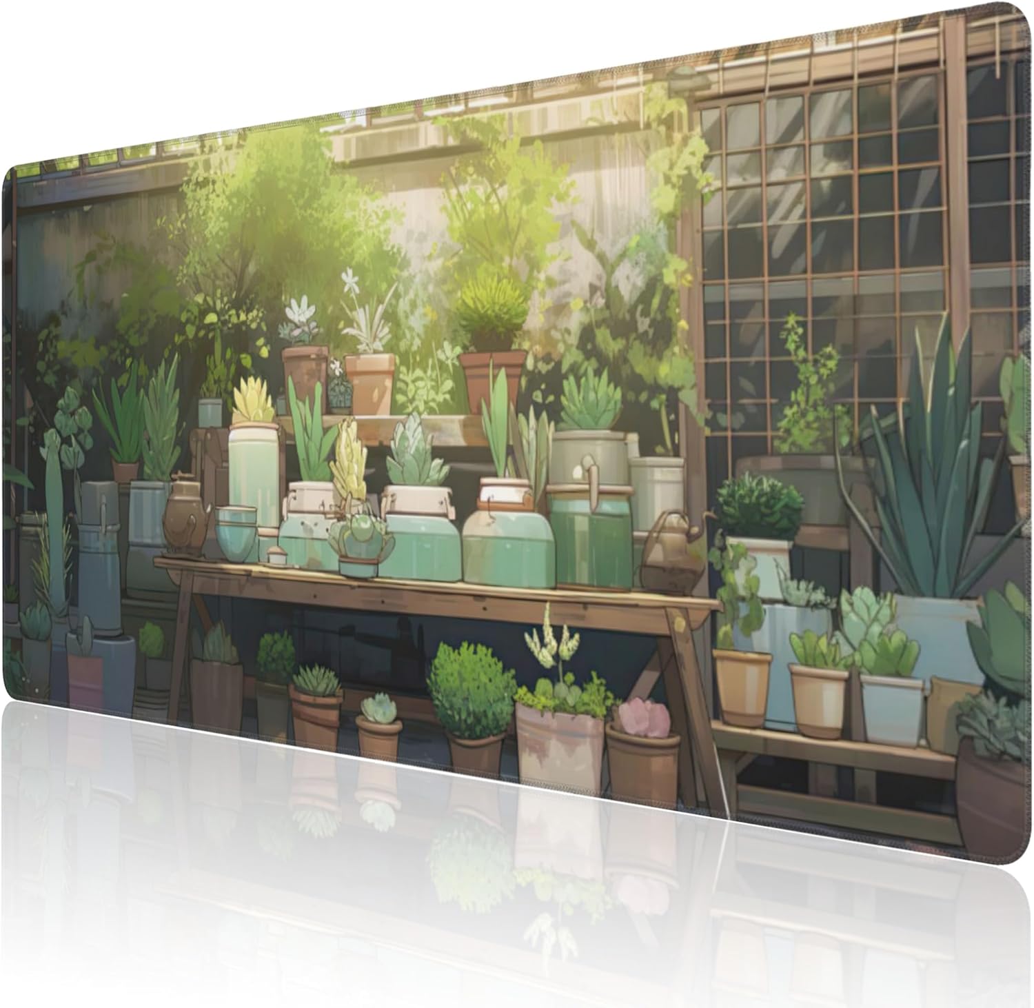 Desk Mat, Cute Lofi Green Extended Large Gaming Mouse Pad for Desk XXL, Non-Slip Rubber Base Stitched Edges Waterproof Long Computer Keyboard Desk Pad Mouse Mat for Home Office Gaming 35.4"X15.7"