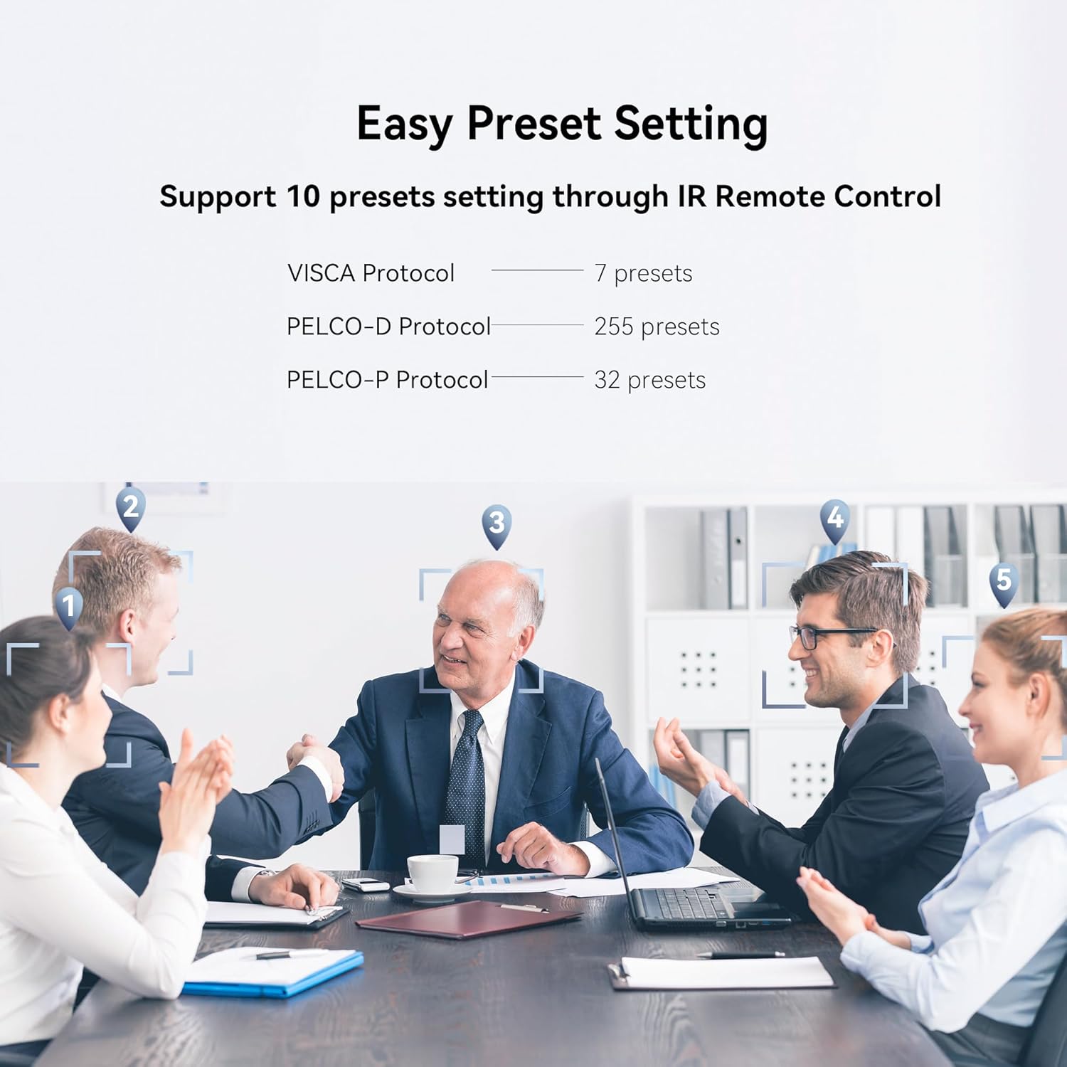 - ๐ใ๐๐ฆ๐จ๐จ๐ญ๐ก ๐๐ง๐ ๐๐ข๐ฅ๐๐ง๐ญ ๐๐๐ง/๐๐ข๐ฅ๐ญ ๐๐จ๐ฏ๐๐ฆ๐๐ง๐ญใTenveo PTZ Conference Camera can be controlled remotely to rotate 350ยฐ (ยฑ175ยฐ) horizontally and 180ยฐ(ยฑ90ยฐ) vertically in an accurate, smooth and silent way. It is also supportive of 10 presets setting through the IR Remote Control and is available to set up to 255 presets via RS232 and RS485 interfaces for professional control. The convenient way could quickly control the PTZ camera pan, tilt, zoom, and move to the preset position for close-up sequence.