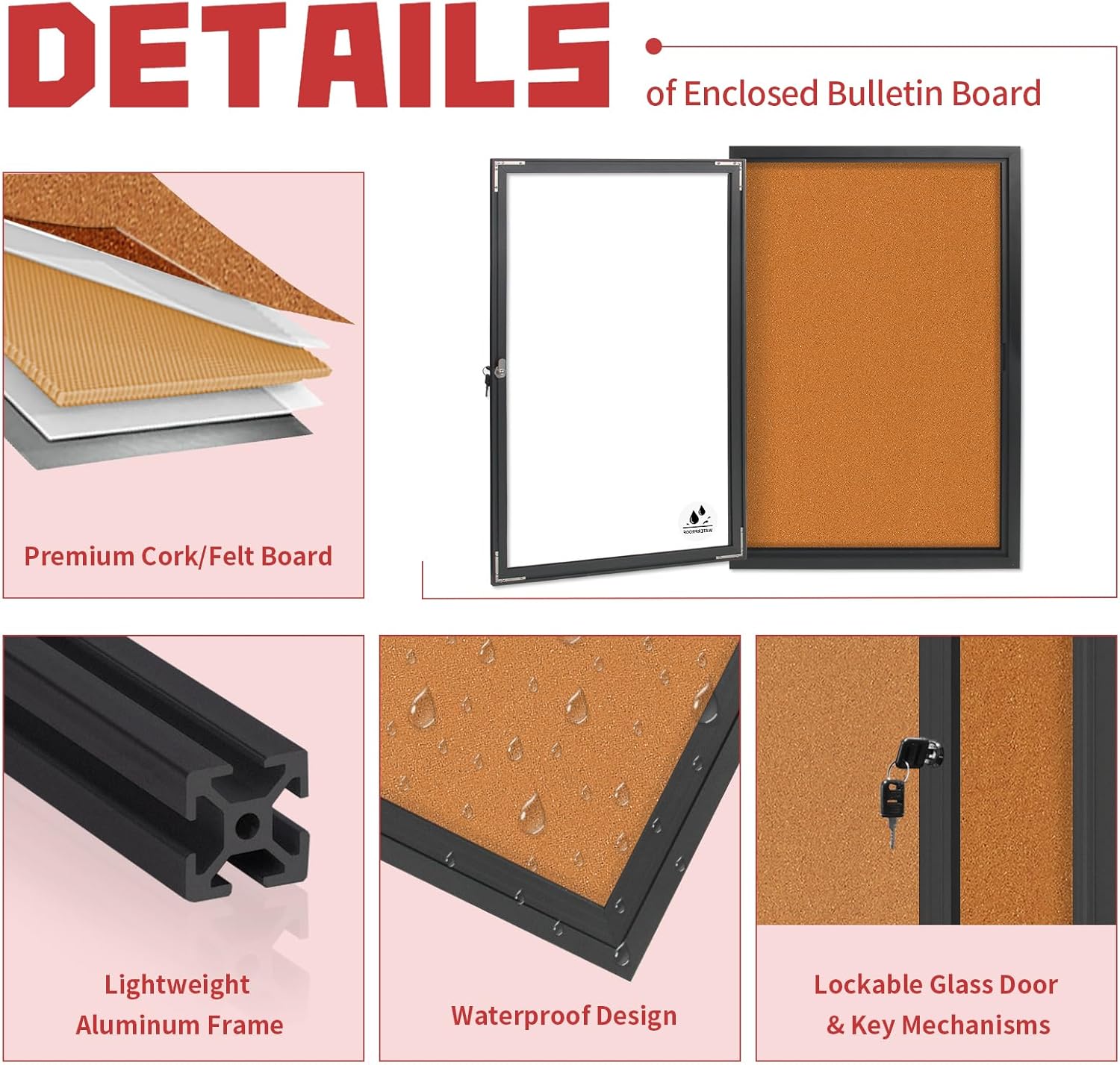 - Self-Healing Enclosed Bulletin Board with Lockable Glass Doors: Made of premium dense cork, this enclosed cork board offers self-healing pin board performance. Ideal for offices, schools, or homes needing a durable, smooth bulletin board that stays flawless.