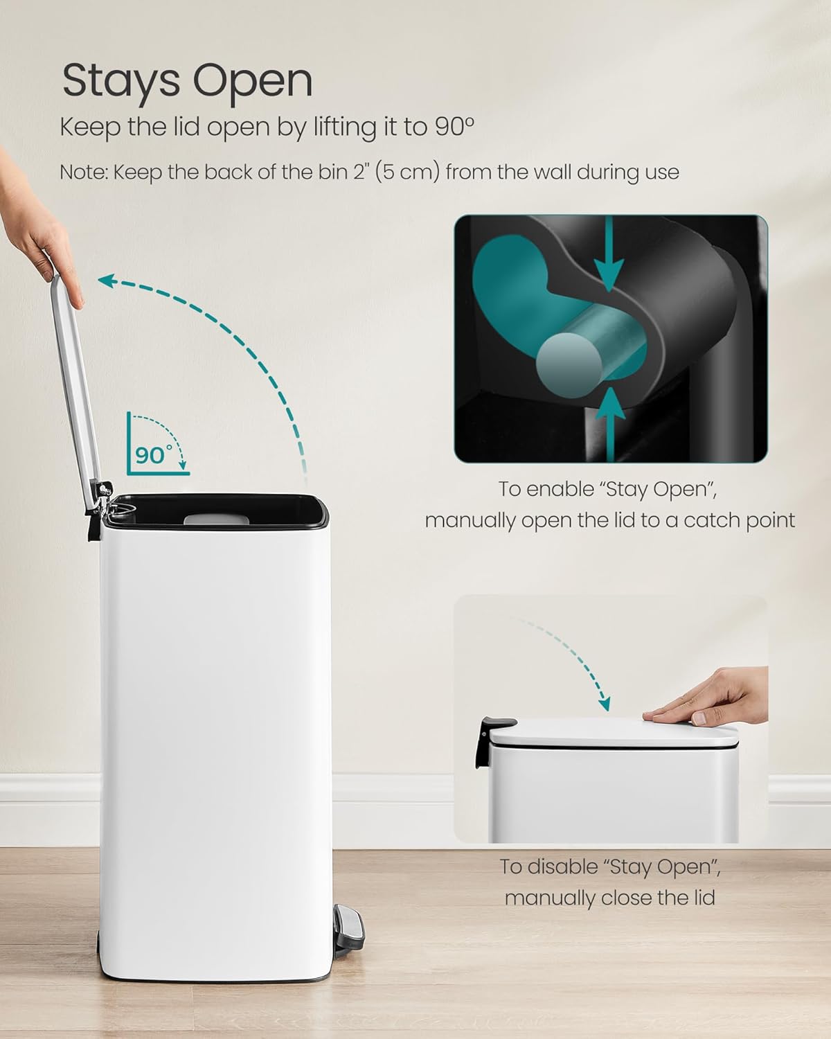 - 【SOFT-CLOSE & STAY-OPEN】This garbage can features a lid that closes quietly and gently without slamming shut. Additionally, you can keep the lid open by manually open it to 90° for easy waste disposal when needed