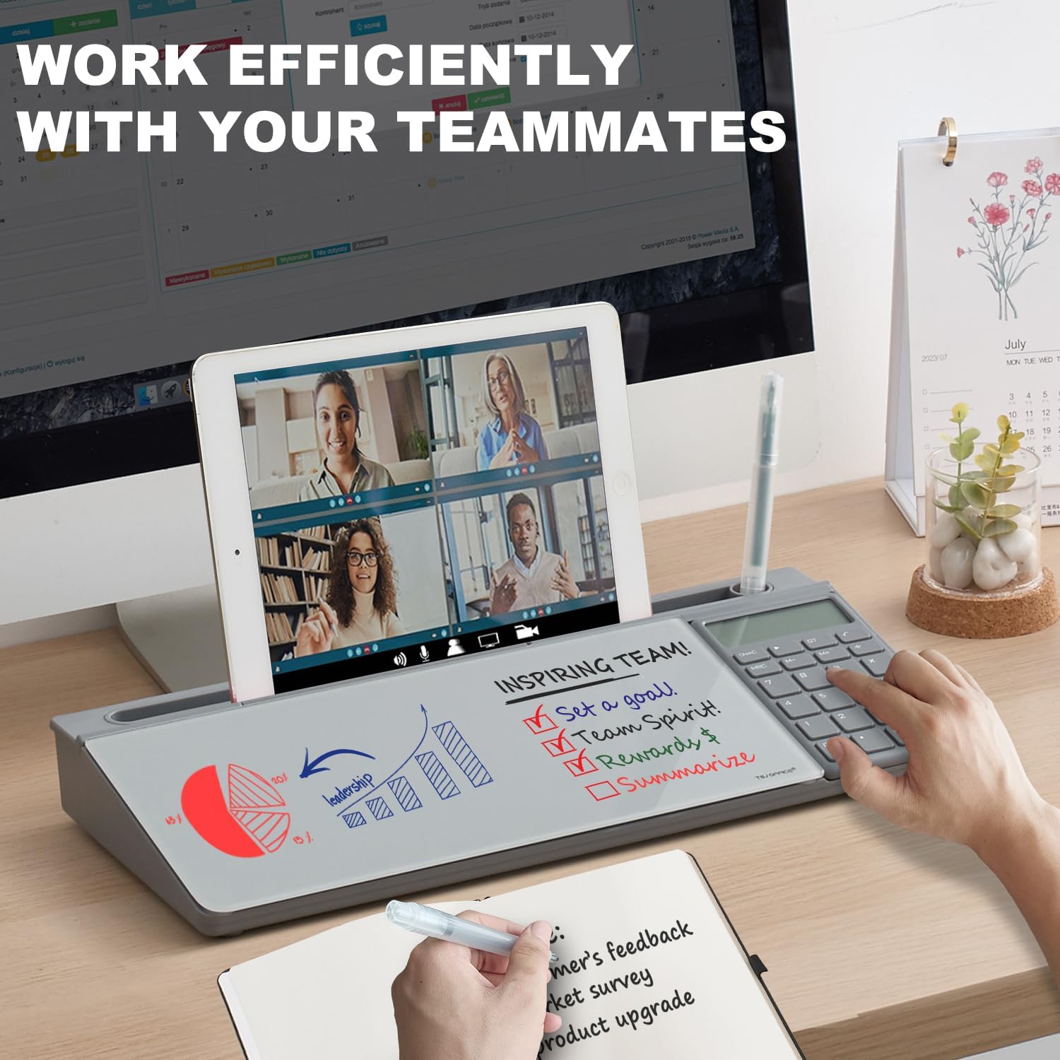 - CONTAINS EVERYTHING YOU NEED - This small glass whiteboard kit includes a W 15.8 " x D 7.1 " x H 1.9 " Desktop glass whiteboard, 4 markers and 1 eraser and A 12-digit standard function calculator. It comes with everything you need. Enjoy the standing whiteboard as soon as you receive it!