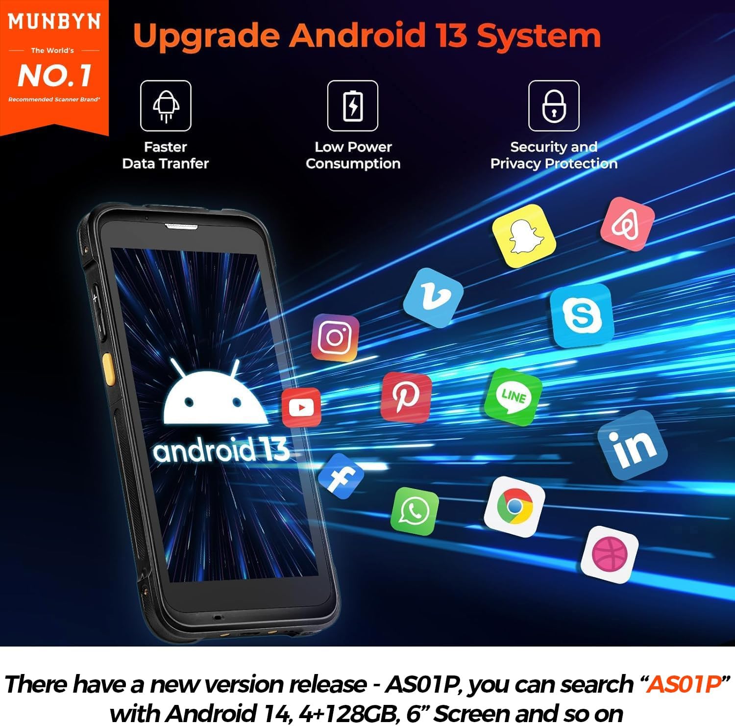 - [New Model] MUNBYN have new model released - AS01P, you can search "AS01P" or "B0DS2F4H8B". Android 14 future android 18 upgradable, 4+128GB, 6" screen.