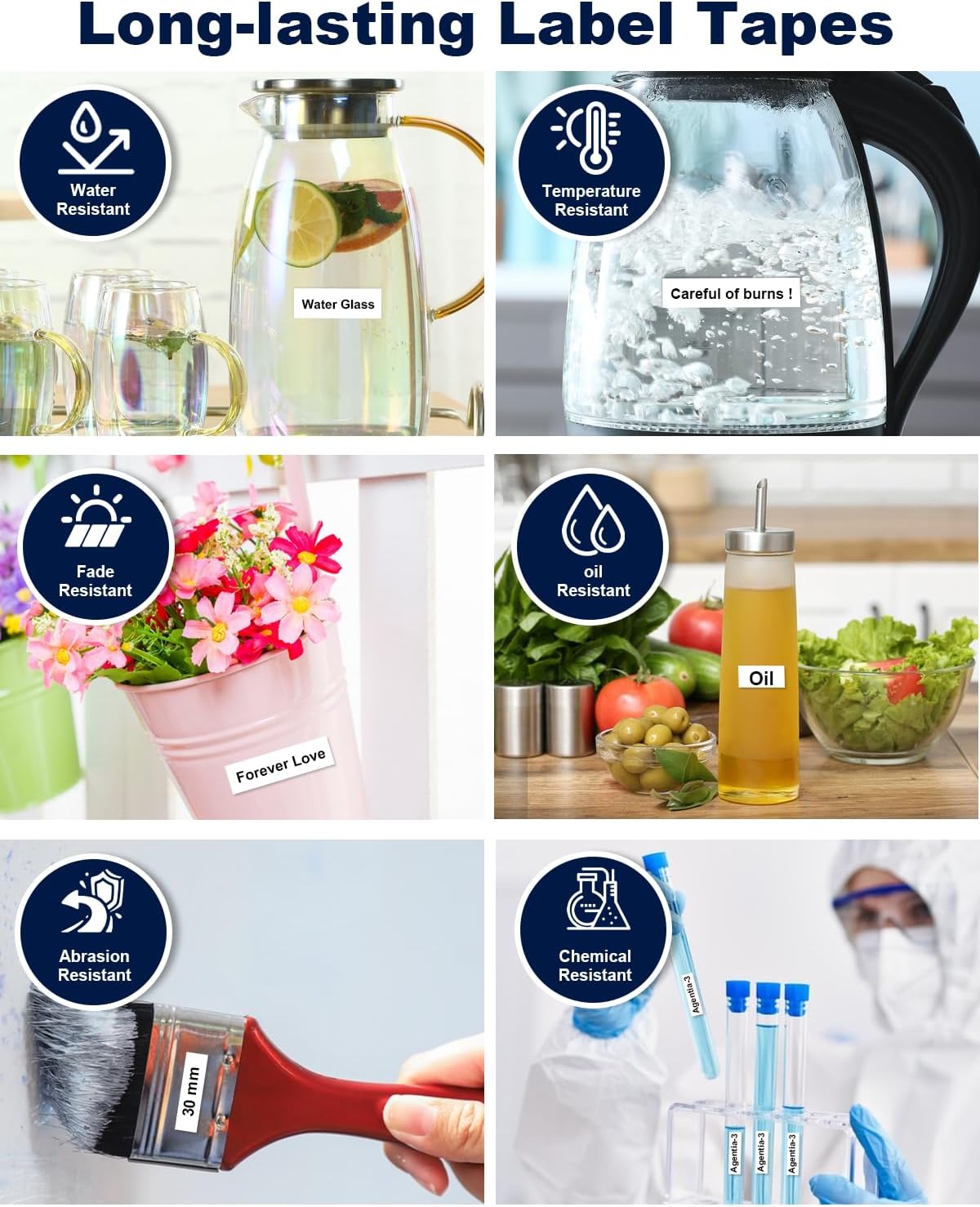 - Widely Applications: These 0.47” Laminated label tapes are great work for indoors and outdoors labeling applications, such as in Home, Office, Government, School, Hotel, Hospital, Restaurant, Factory, Bank, Laboratory, Warehouse, Farm, Repair Shop, Stores, Supermarkets and others more. Help you quickly identify the items