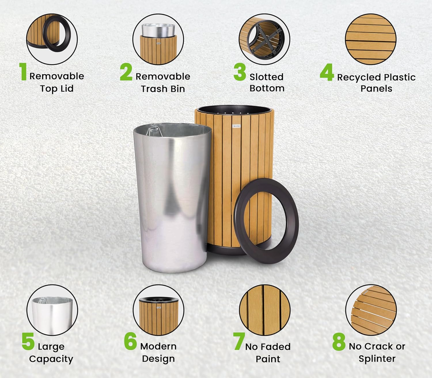 - HIGHLY DURABLE: Built with premium quality materials and recycled plastic cedar slates, this garbage receptacle can ensure a long life and hold up against all weather conditions.