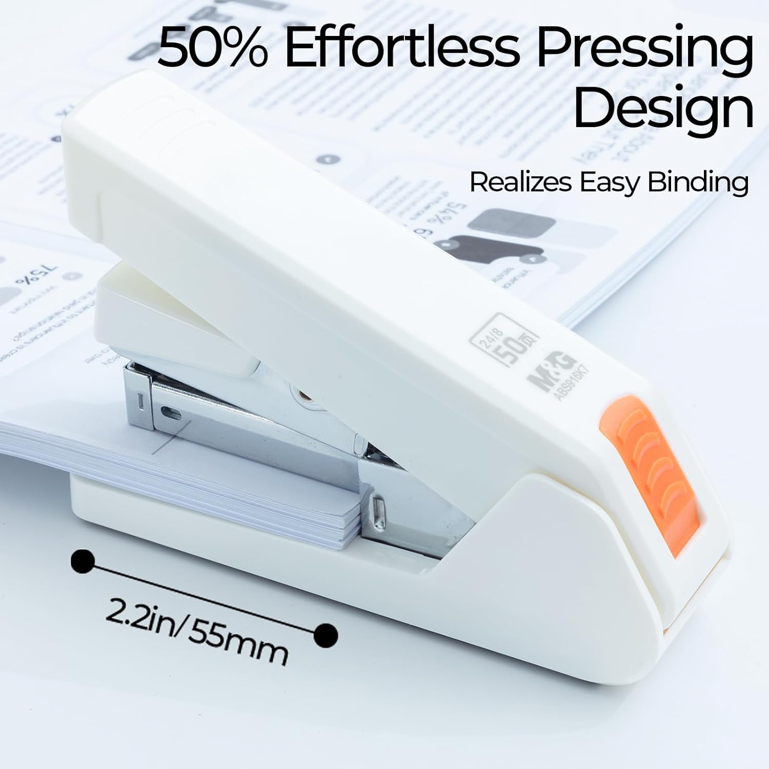 M&G Effortless Stapler 50 Sheet Capacity One-Touch Stapling, Heavy Duty Desktop Stapler Includes 1000 Staples and Remover, Portable Handheld Staplers for Home & Office (White)