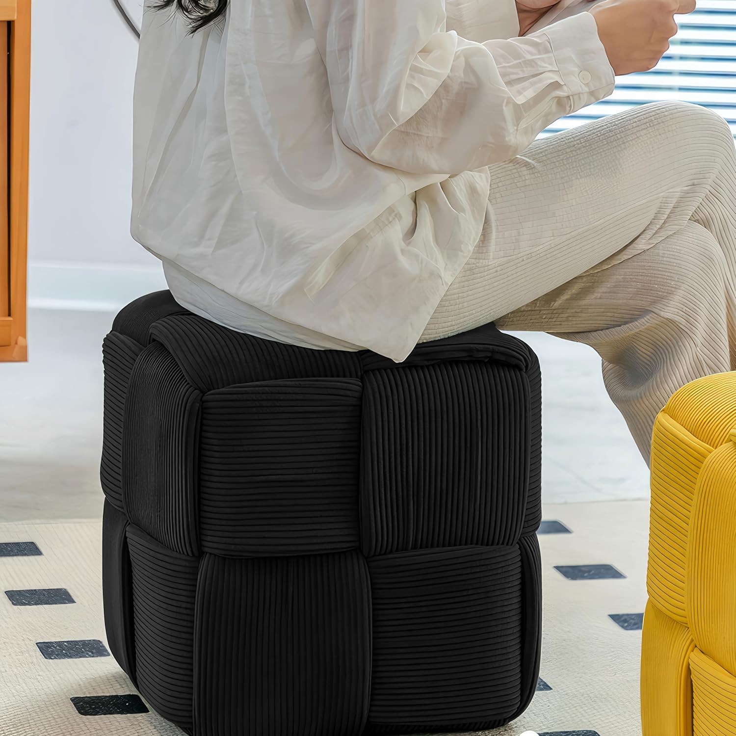 Ottoman Foot Rest Soft and Comfortable Ottoman Square Corduroy Woven Design Sofa Stool (Black)