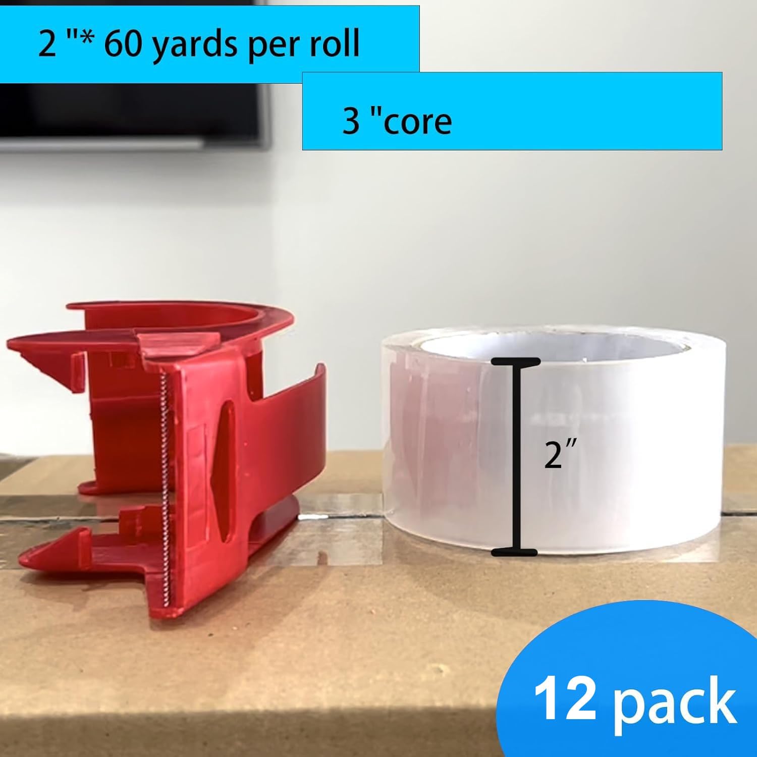 - Set: 12 rolls 2 inches X 60 yards transparent BOPP packaging tape total of 720 yards, with a dispenser.