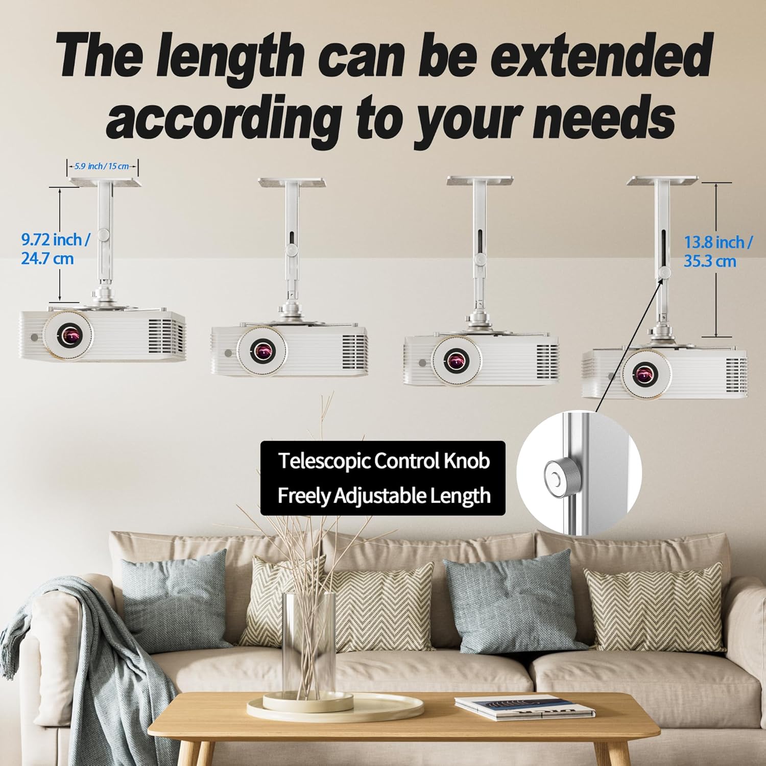 - 【Easy to Install】The projector stand has a maximum length of 13.8 inch / 35.3 cm and a retractable height of 9.72-13.8 inch. It provides flexible installation, you can choose ceiling or wall installation according to your preferences and space requirements, just drill 4 holes on the load-bearing wall or ceiling to complete the installation. Perfect for use in classrooms, conference rooms, hotels, home theaters, or anywhere a projector needs to be installed!