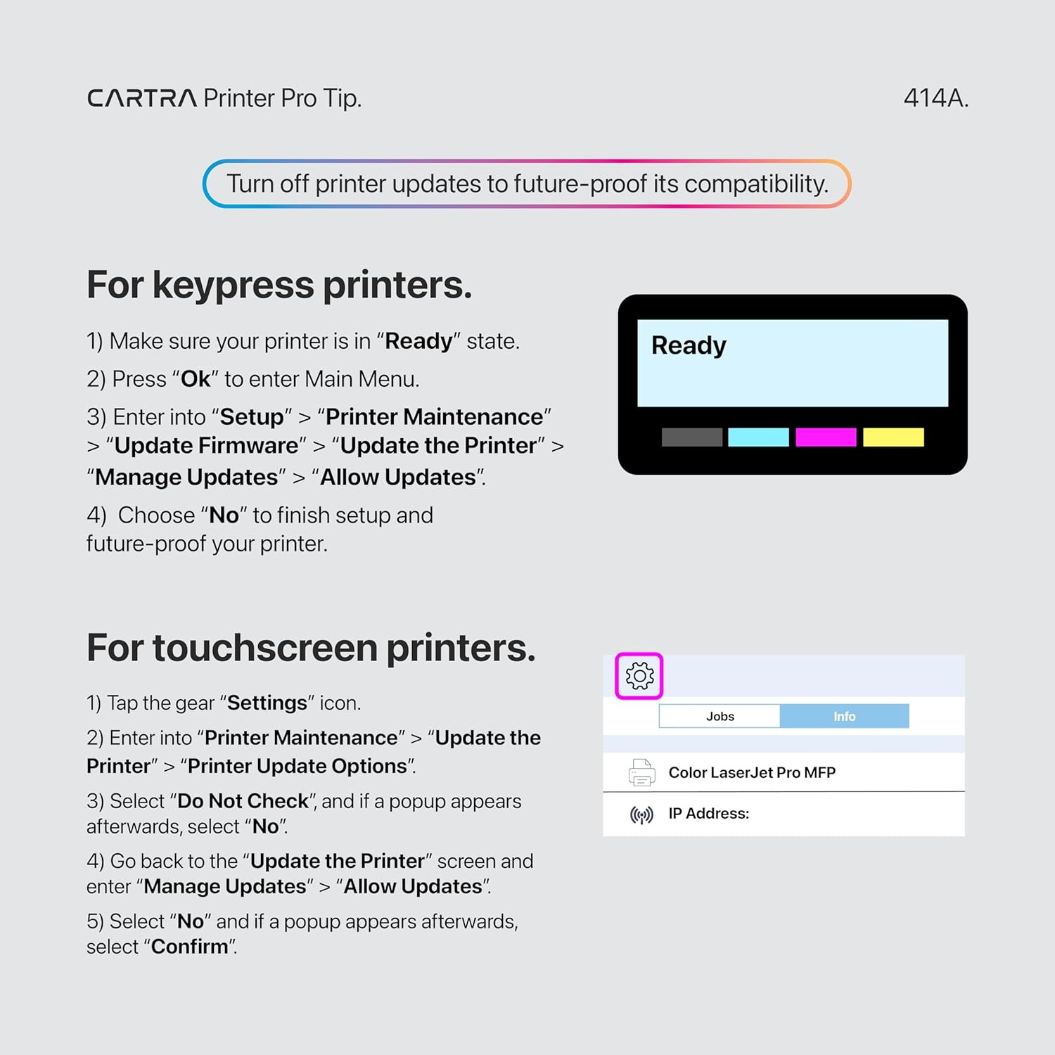 - High page yield & quality: Print up to 2,400 black and white pages and 2,100 color pages without compromise. Our 414A cartridges deliver consistent, high-quality prints without fading, streaking, or leaking, backed by our Cartra Page Yield Promise.