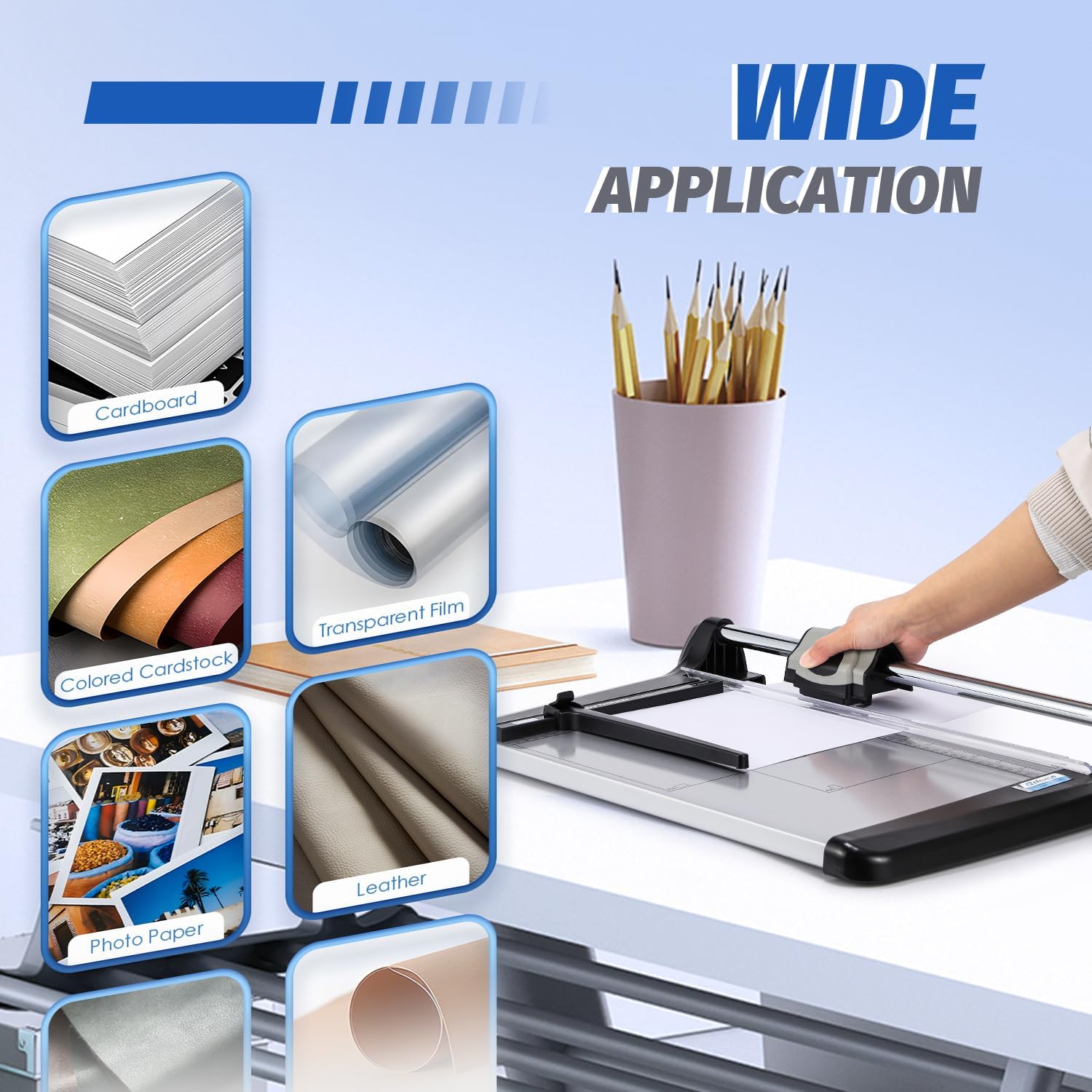 - Wide Application---This rotary paper cutter has a wide range of applications. It can be used for photos, laminating card, cardboard, thin leather, etc, which can especially meet the needs of cutting drawings.