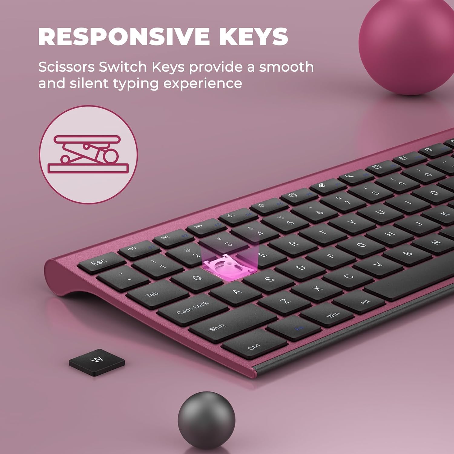 - ♥COMPACT AND SLIM: Ultra slim (5.5mm) keyboard looks more stylish and elegant. High-End Scissor Switch design provides a better tactile response and comfortable and whisper quiet typing experience