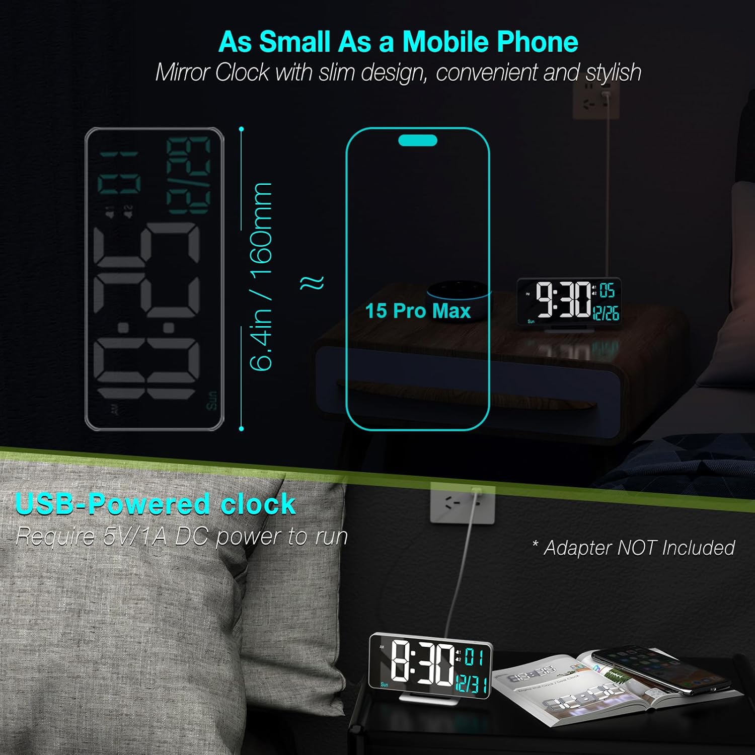 - [6.7in White Alarm Clock] This stylish LED desk clock features 6.7-inch display of mirror clock style, dual alarms, 12/24-hour format, date, day of week, seconds, temperature (℉ / ℃), and auto/manual dimming, it is also a aesthetic digital calendar and cute alarm clock for bedroom with white and sky blue numbers. Additionally, the bright white and sky blue digits make the desk clock cool and easy-to-read.
