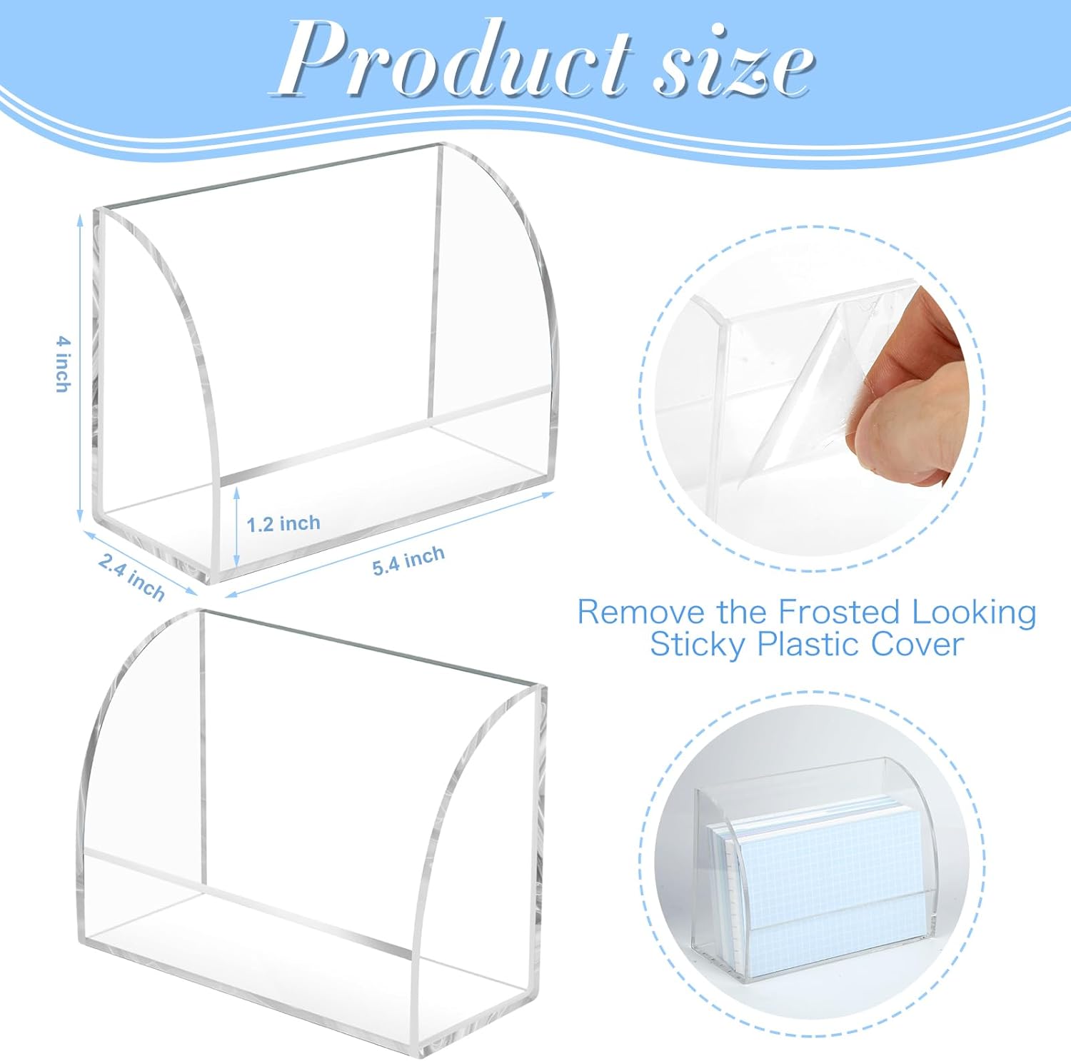 - 【Frosted film protection】 The acrylic postcard holder will be protected by a frosted film when shipped, you just have to remove the frosted looking sticky plastic covering from this business card holder first. Find an edge and peel it away - you’ll have a beautiful clear acrylic finish!