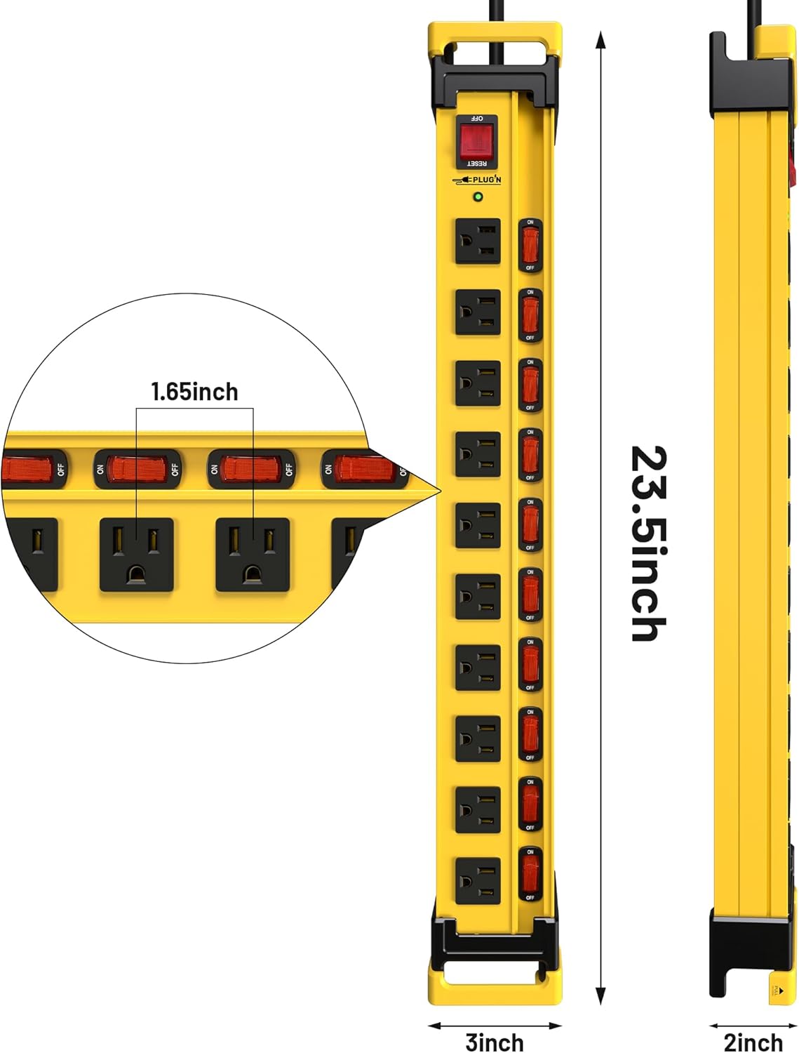 Plug'n 12 Outlet 13 Individual Switches,3300J Surge Protector Power Strip,9FT/14AWG/15AMP/1875W Power Cord,Heavy Duty Metal Power Strip with Cord Manager for Workshop,Garage,Shop