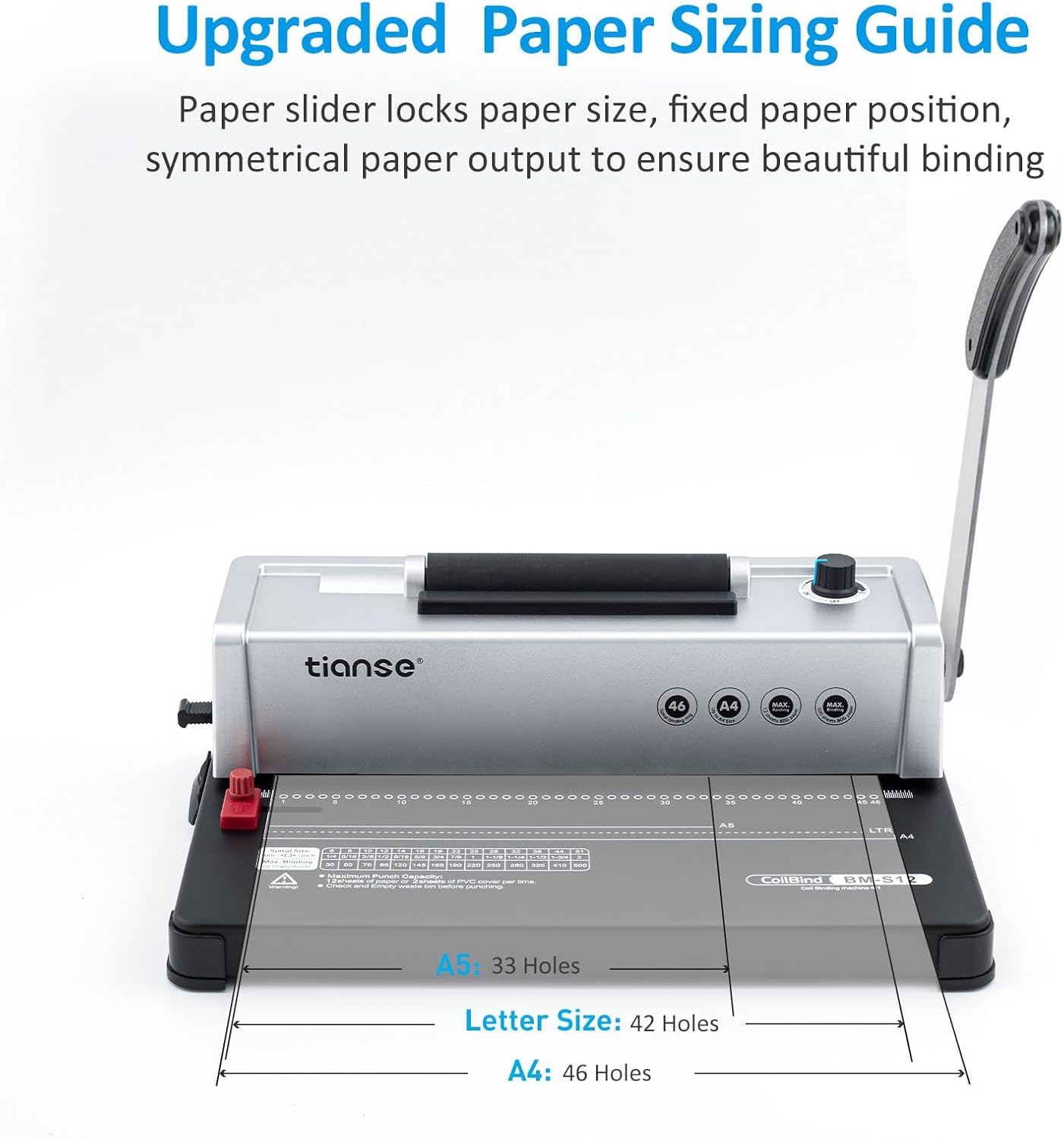 - Multiple Size Adaptability:Tianse coil binders are compatible with Letter, A4 and A5 sizes, and the unique open-throat design allows for the insertion of large and non-standard pages to meet the needs of special projects. The mounting handle needs to be 90 degrees vertical to ensure precise operation and flexible response to a variety of binding tasks