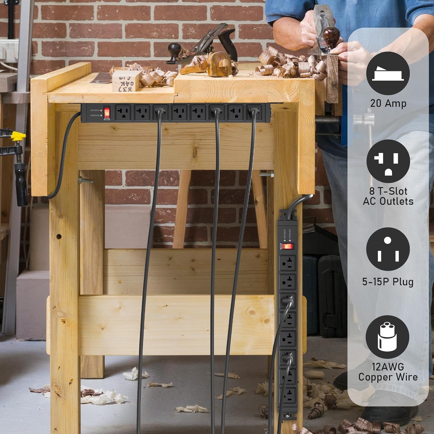 JUNNUJ 20 Amp Power Strip Surge Protector 4800J, Heavy Duty 8 Outlet Metal Multi Angle Mount, 20A Garage Power Strip Shop 6-20R T-Slot, 5-15P Plug 12 Gauge Extension Cord 15ft for Appliance