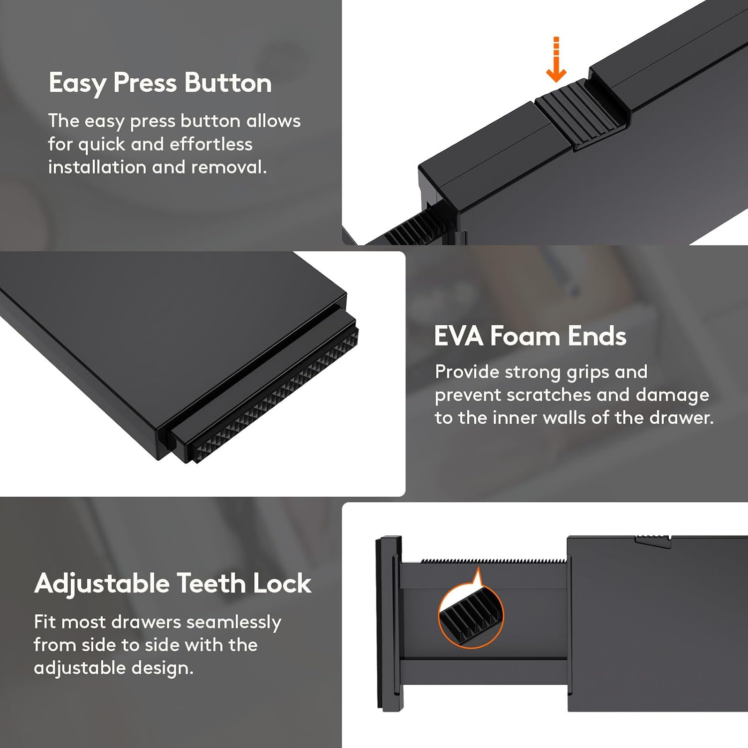 - Easy to Install: To adjust the length, press the top button before placing the drawer organizer, and then stretch it out again to secure it tightly. The strong spring tension keeps each organizer upright and secure. When retracting, press the top button and push in the stretched side.