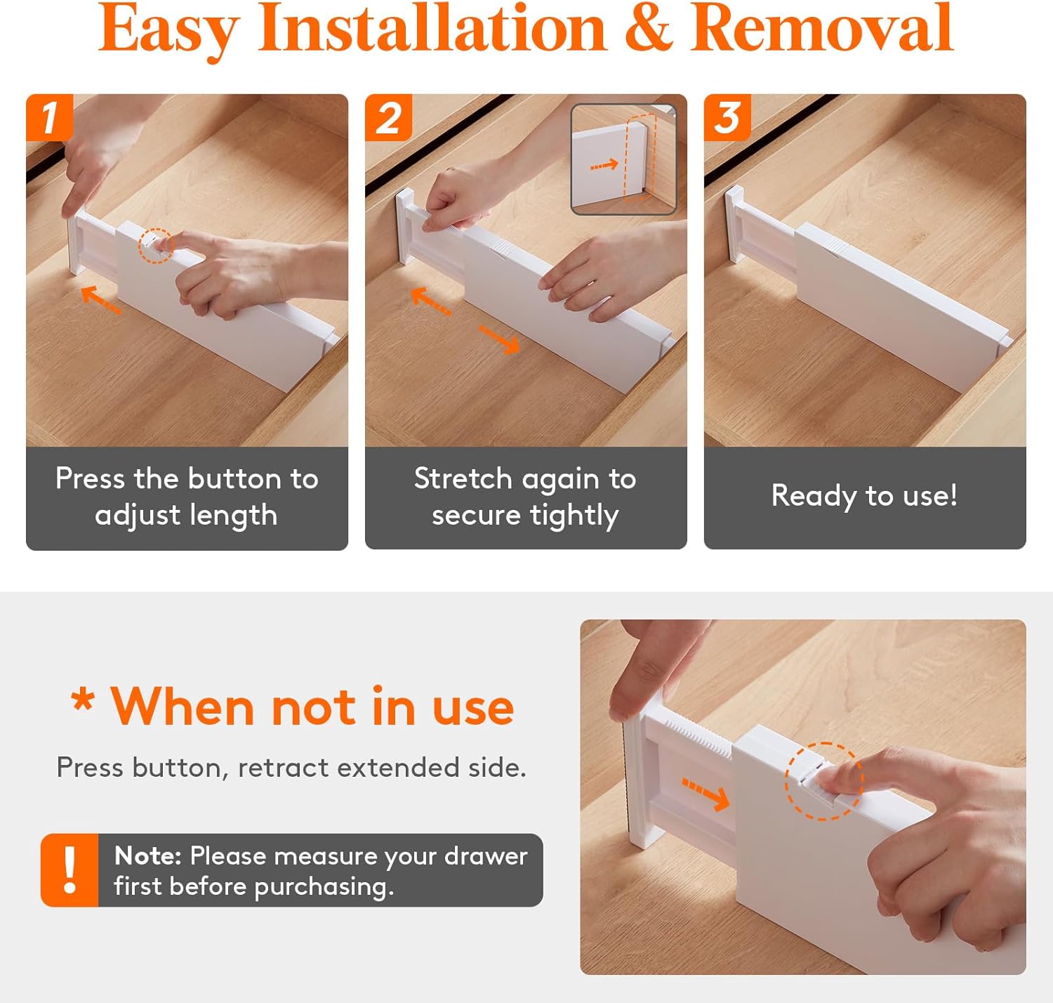 - Easy to Install: To adjust the length, press the top button before placing the drawer organizer, and then stretch it out again to secure it tightly. The strong spring tension keeps each organizer upright and secure. When retracting, press the top button and push in the stretched side.