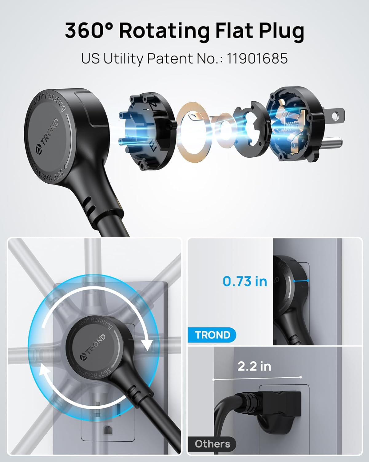 - 360° Rotating Flat Plug (US Patent No. 11901685): The 360° rotating flat plug is designed for ultimate flexibility, making it easy to place on the left or right of the wall outlet, and allowing the plug to fit flush against walls and maneuver into tight spaces without obstructing furniture or other outlets.