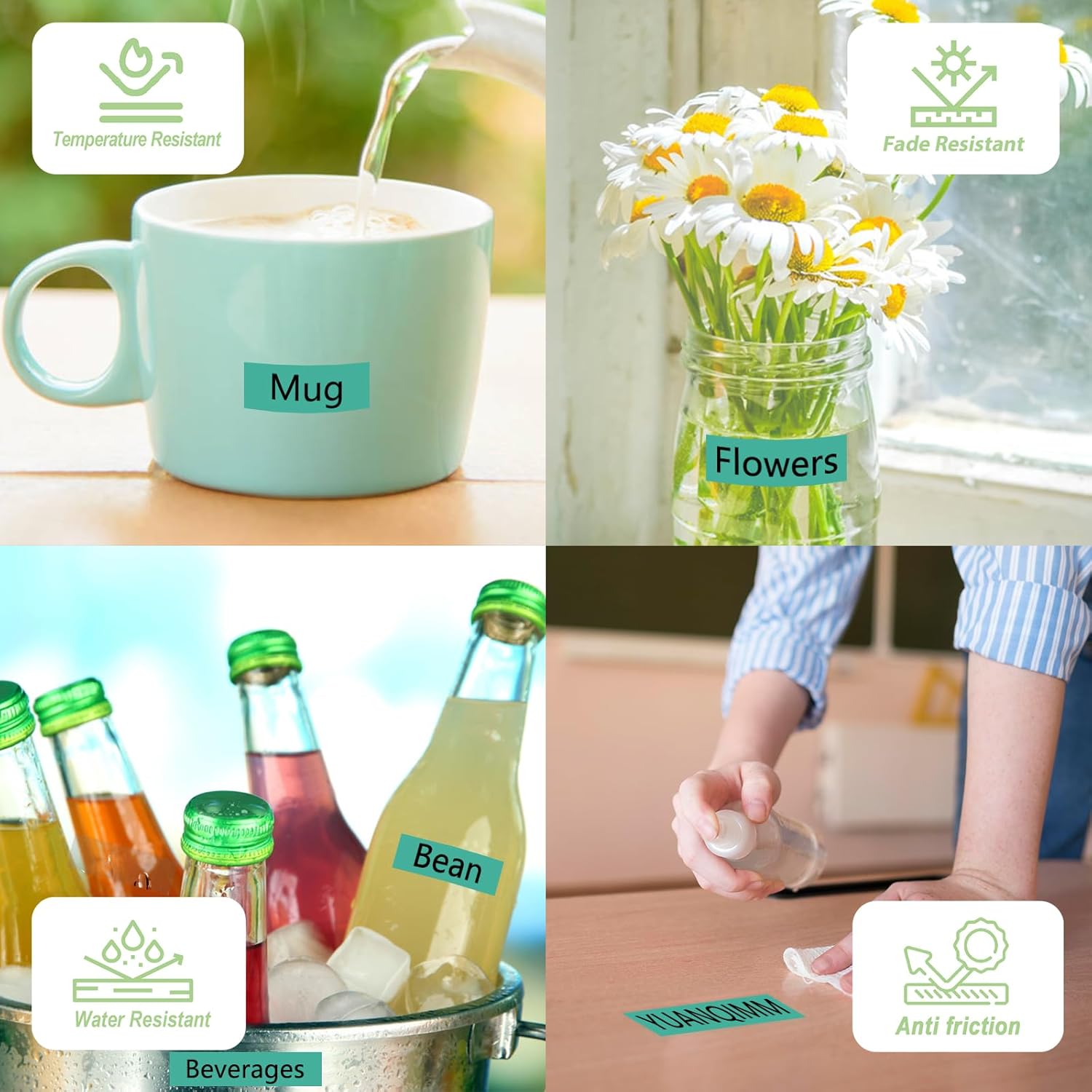 - Features: Water resistant Fade resistant Temperature resistant Corrosion resistant Abrasion resistant Grease resistant Grime resistant and Chemical resistant