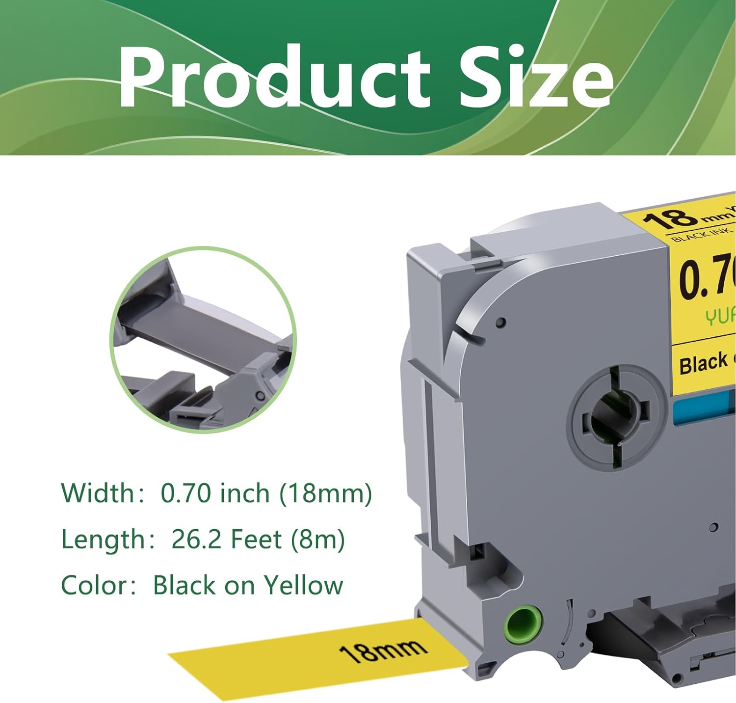 - Product Size: Width: 18mm 0.7 inch, Length: 26.2 feet (8m) for each 18mm 0.7 inch laminated yellow label tape