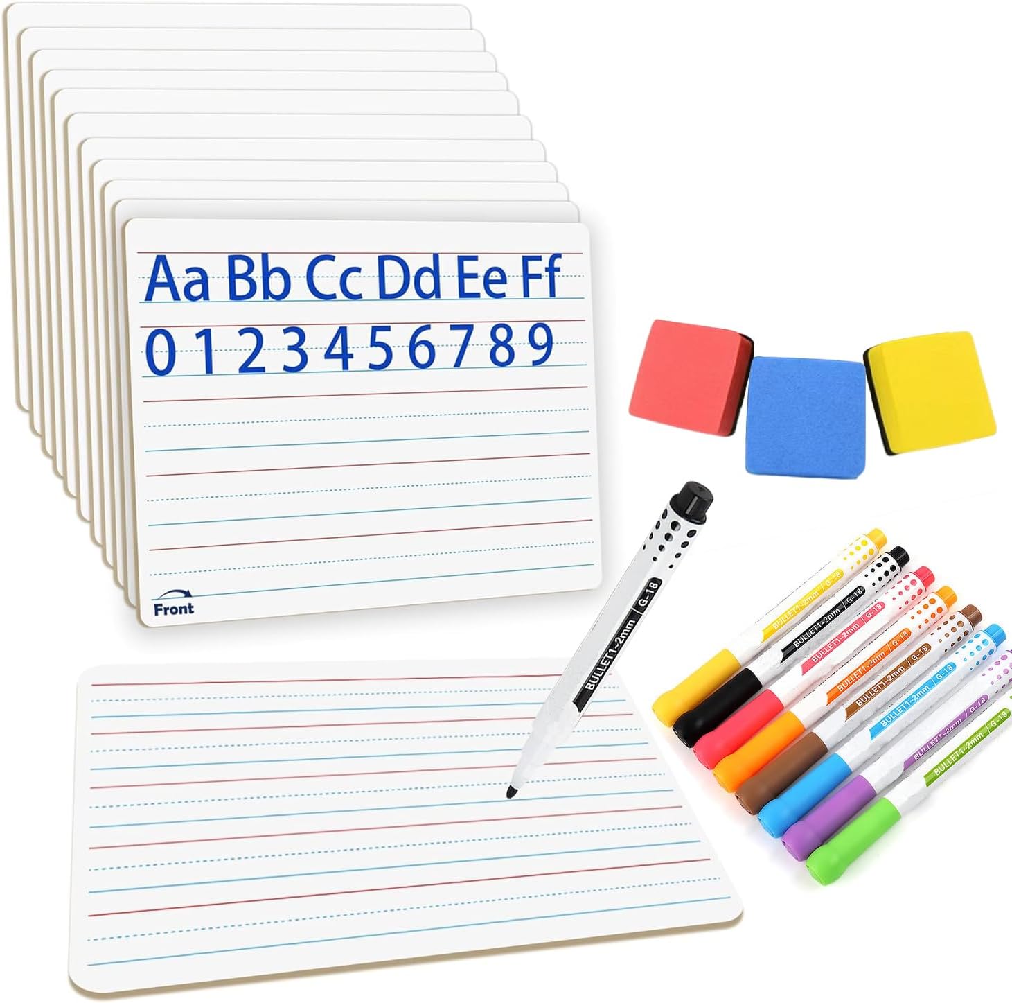 12PCS Dry Erase Boards,9"x12" Double Sided Small Whiteboards with Lines,Students,Education Teacher Classroom,Mini Portable Drawing Learning Lapboards with Colors Pens and Erasers.