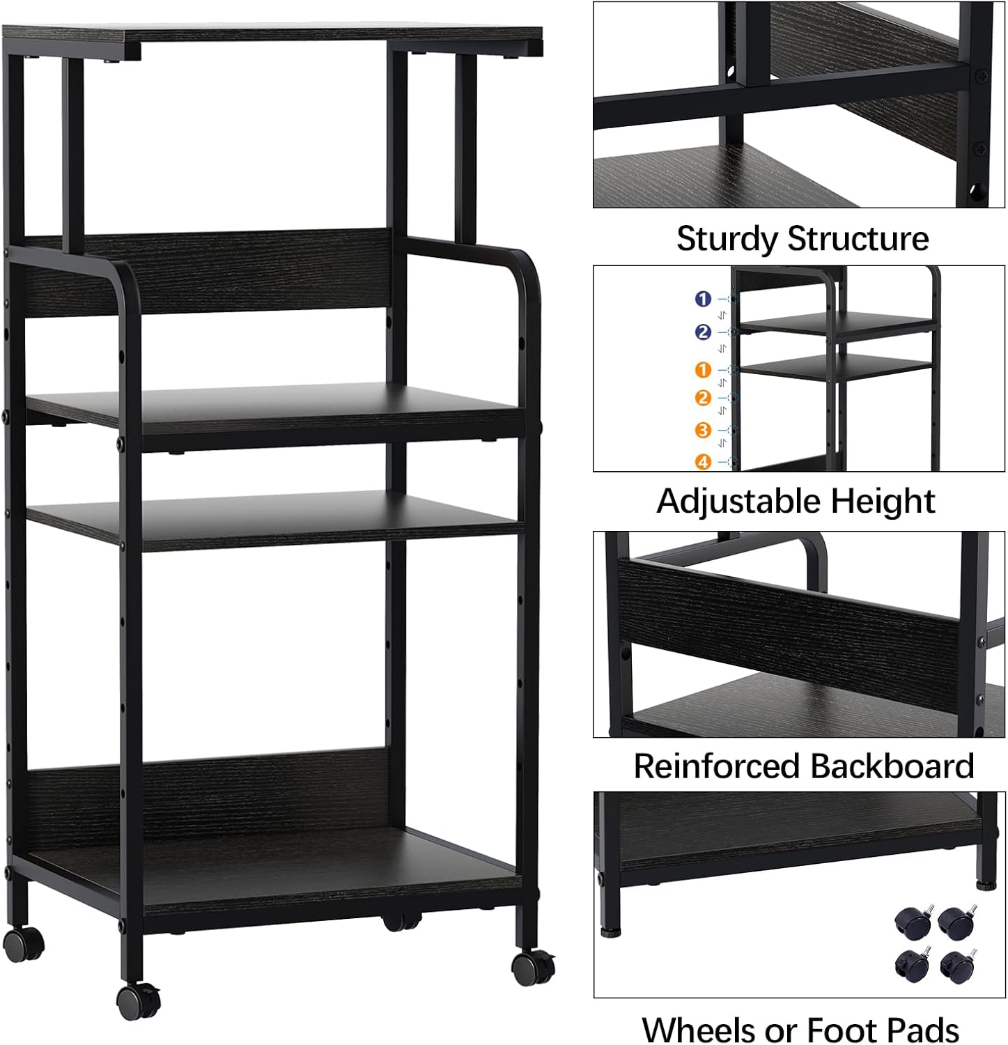 4 Tier Stand with Storage Shelf, Tall Mobile Printer Table for Home Office, Adjustable Stands for Heat Press Scanner Fax (Black)